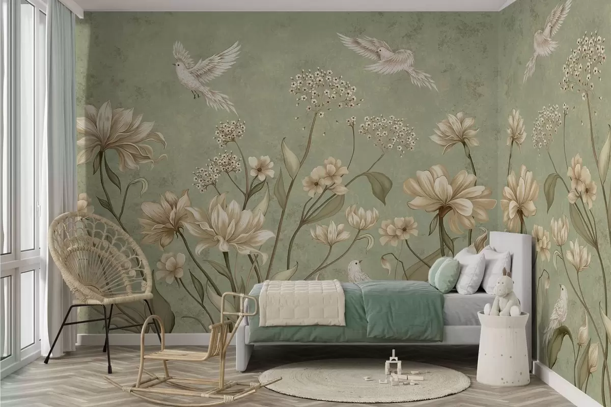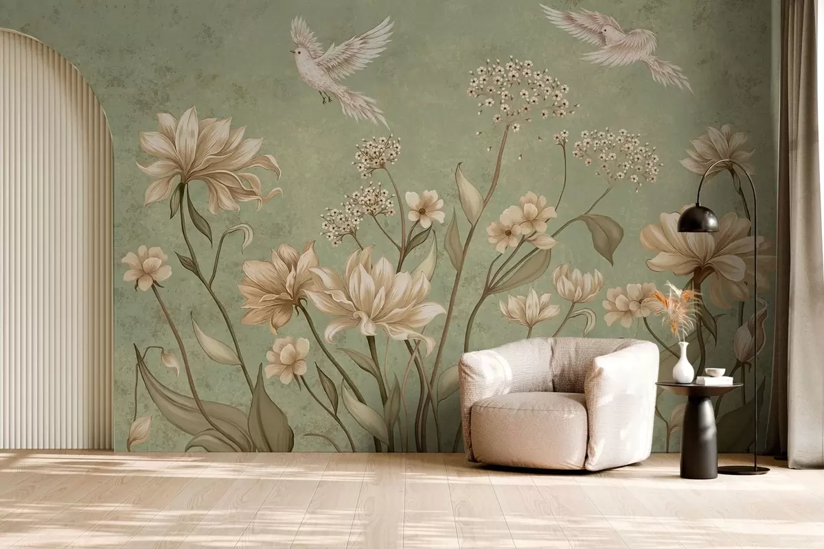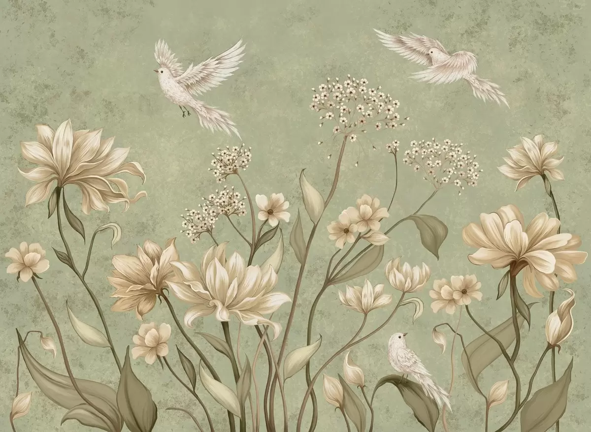 Fototapetes Ziedi un putni uz zaļa faktūru fona Nr. w05118v1