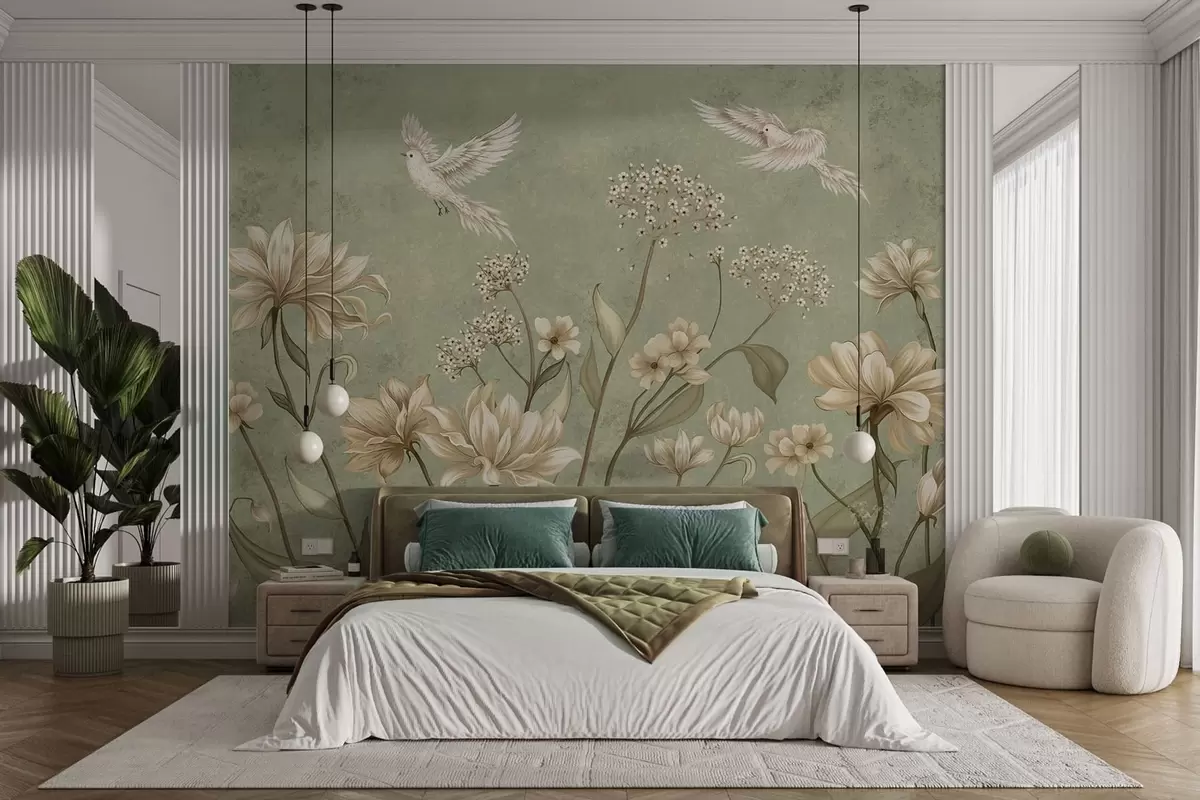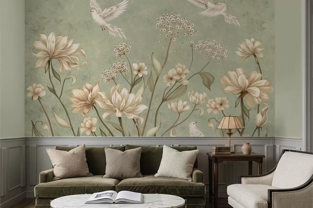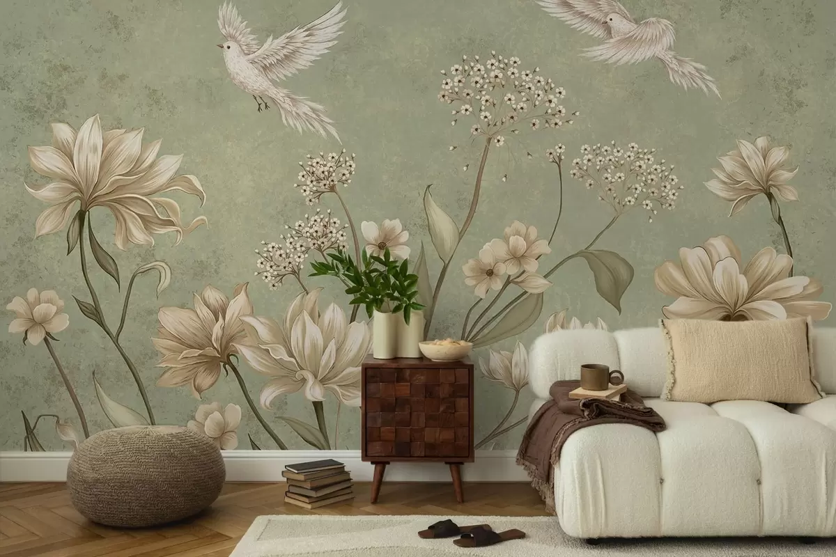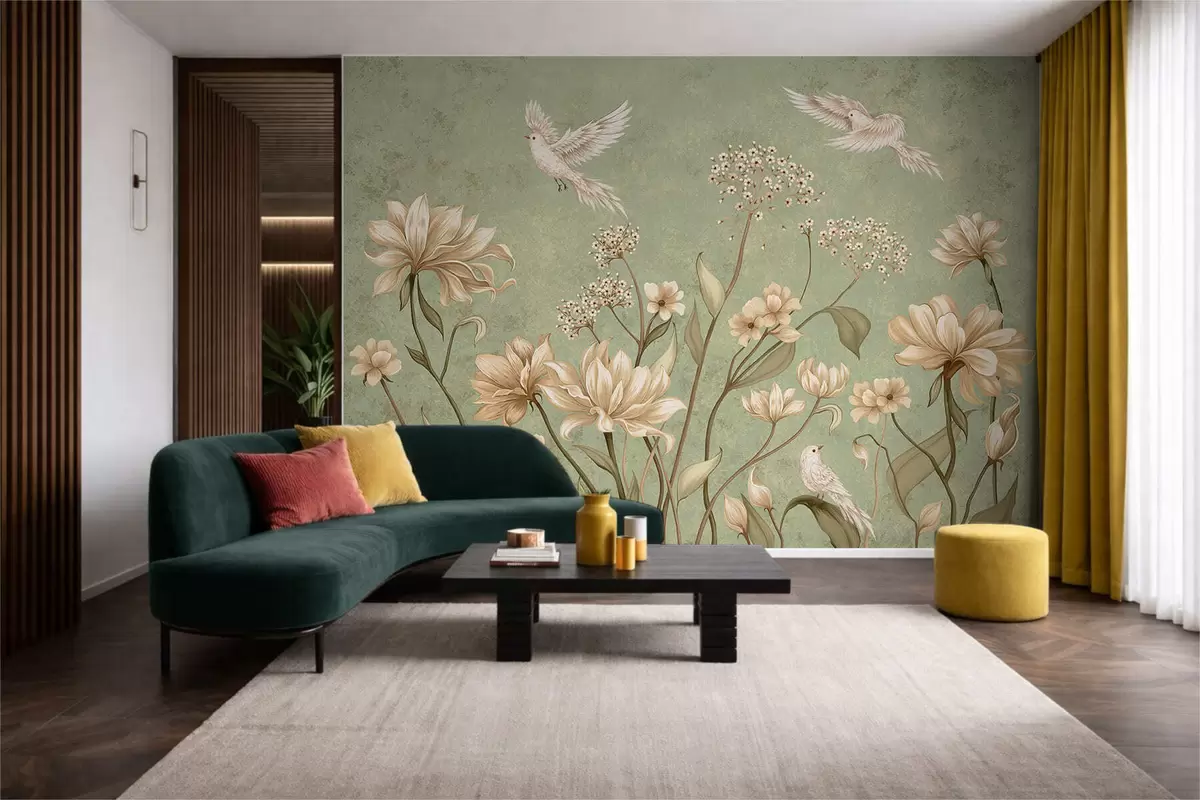 Fototapetes Ziedi un putni uz zaļa faktūru fona Nr. w05118v1