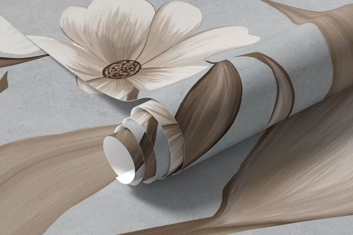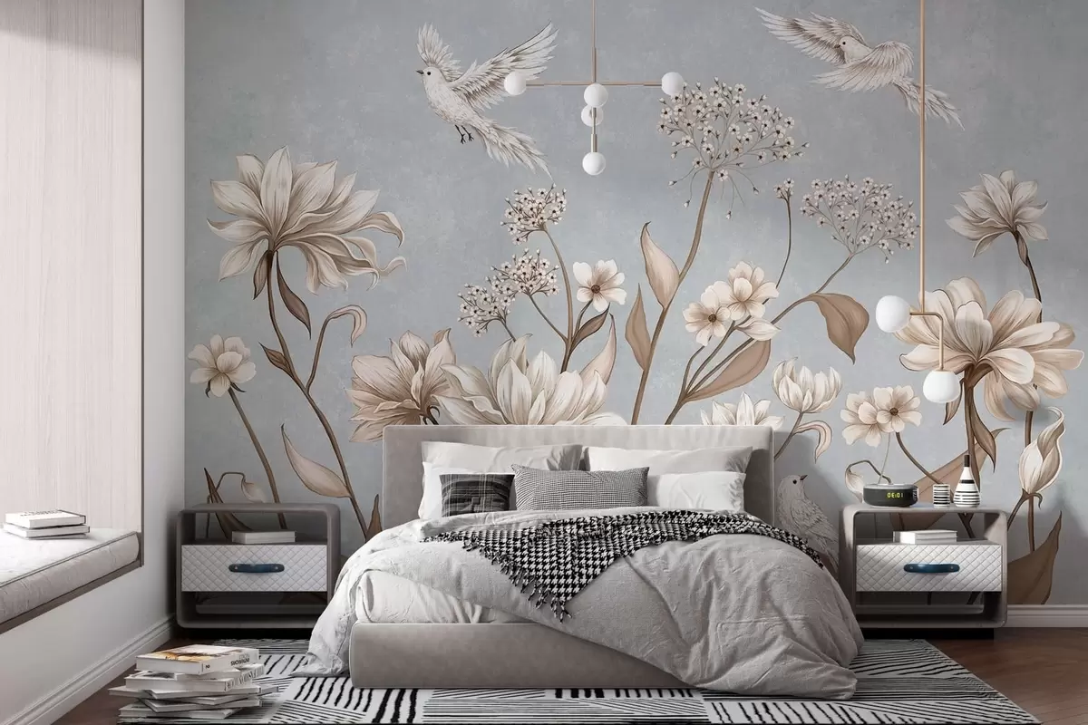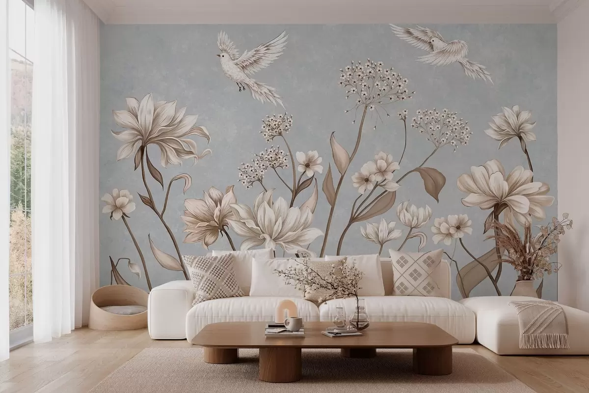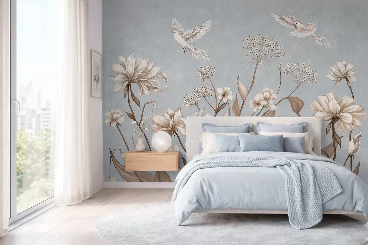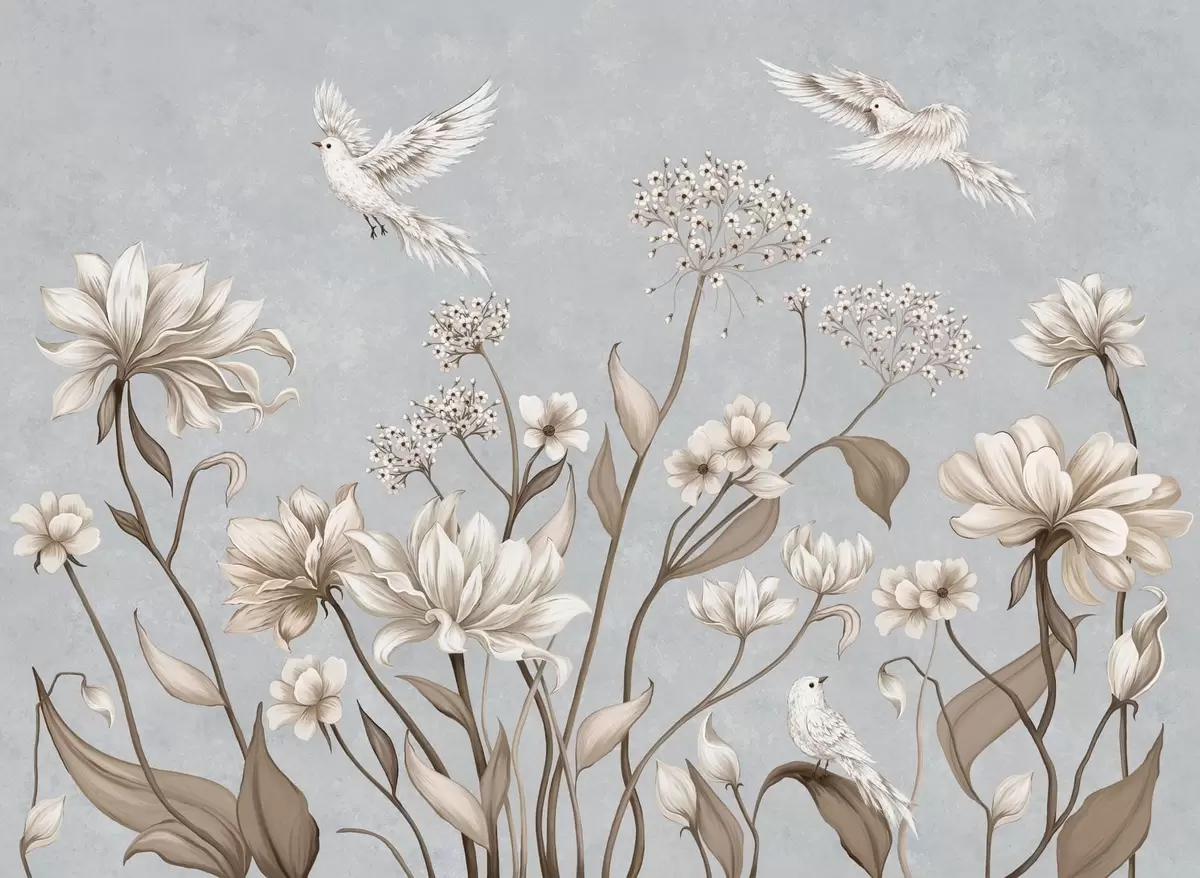 Fototapetes Ziedi un putni uz vēsā pelēkzila fona Nr. w05118v2