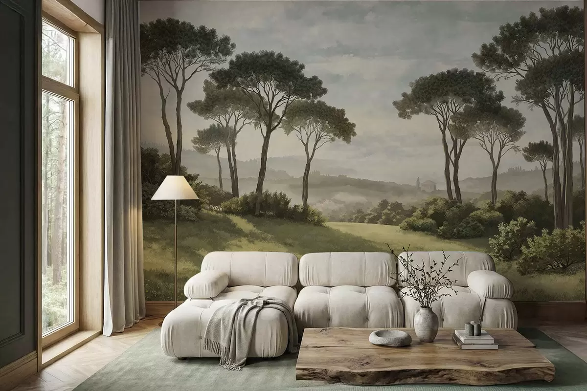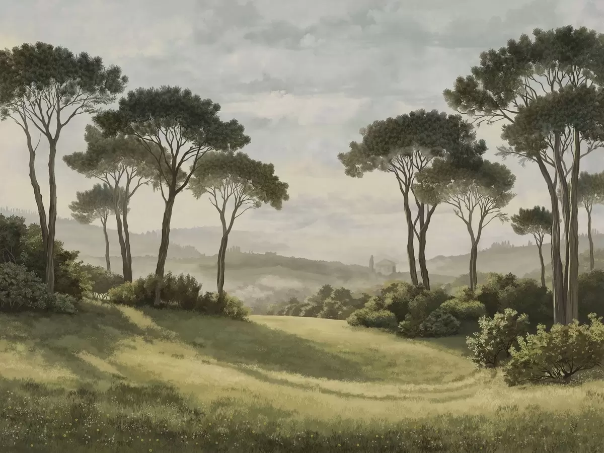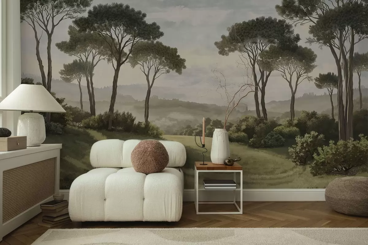 Fototapetes Ainava ar kokiem, pļavu un miglu tālumā Nr. w05122v1