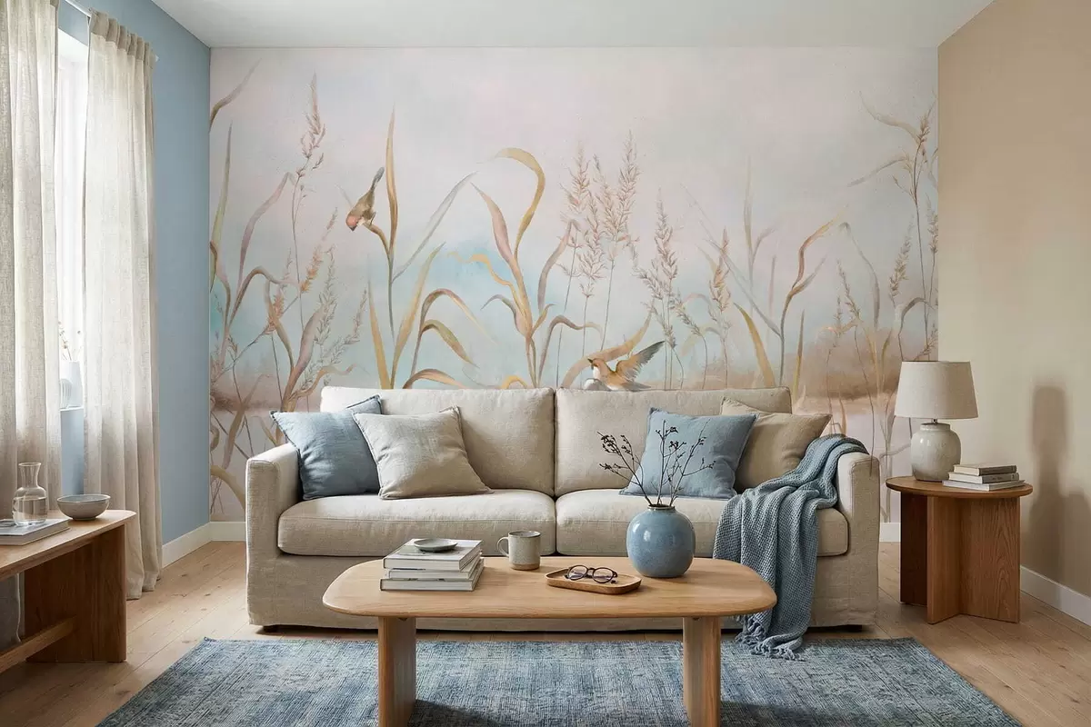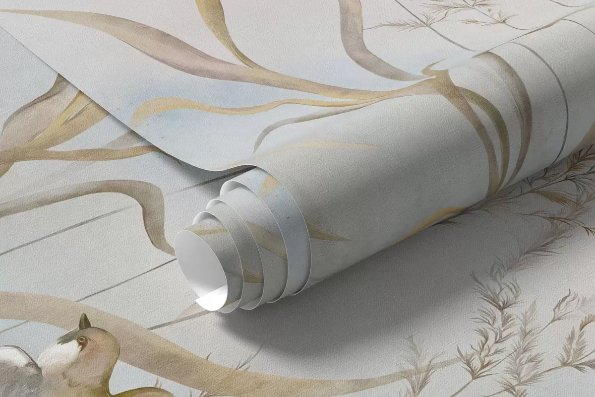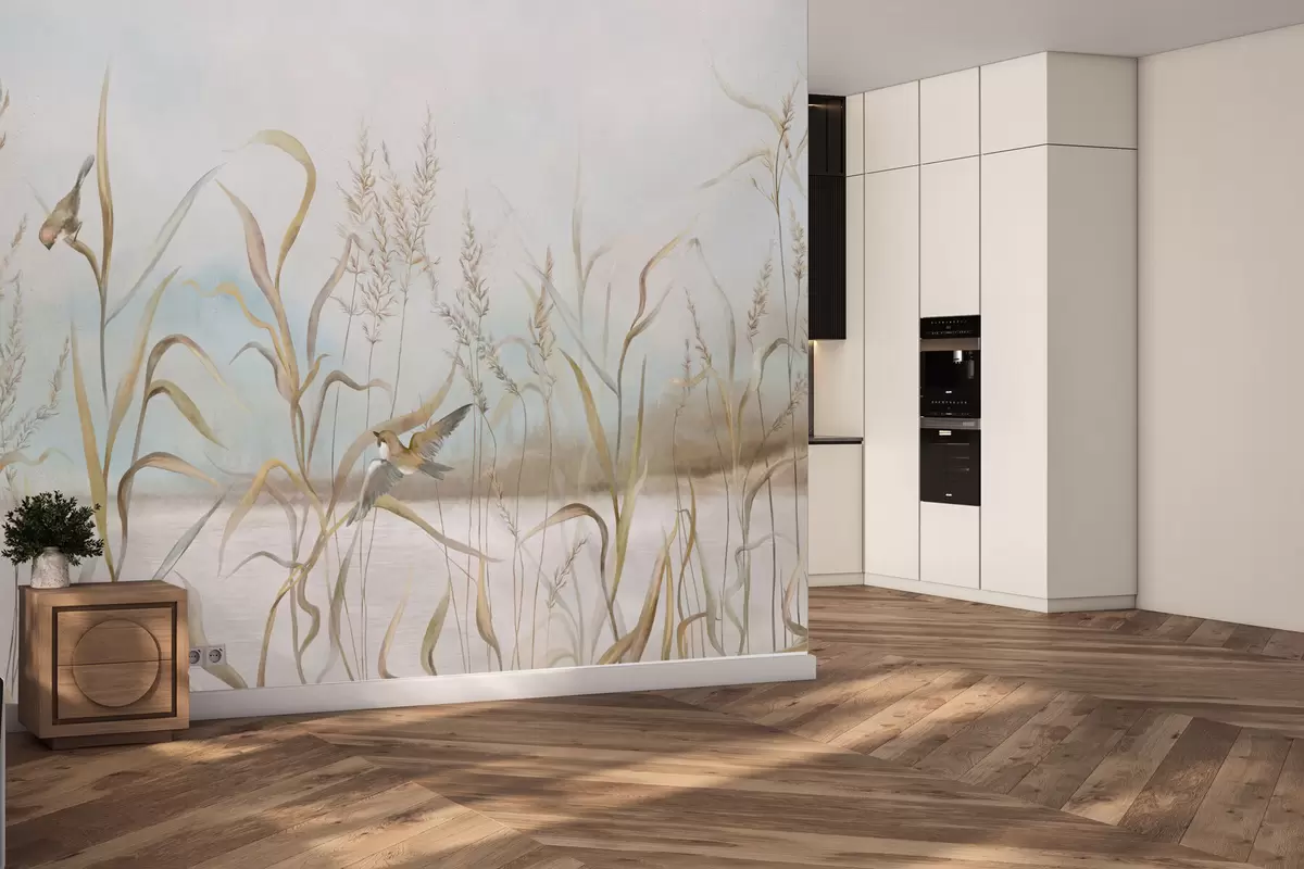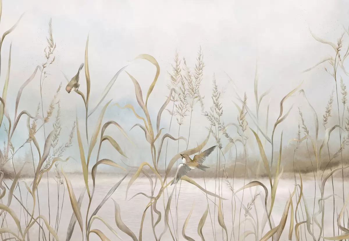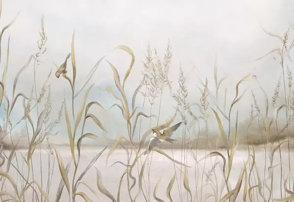 Fototapetes Ilustrācija ar niedrēm un putniem pie ūdens maigās toņos Nr. w05125