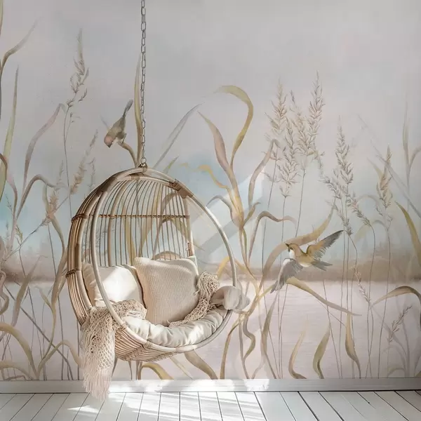 Fototapetes Ilustrācija ar niedrēm un putniem pie ūdens maigās toņos Nr. w05125