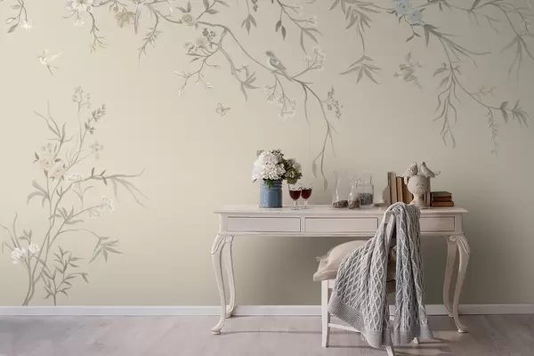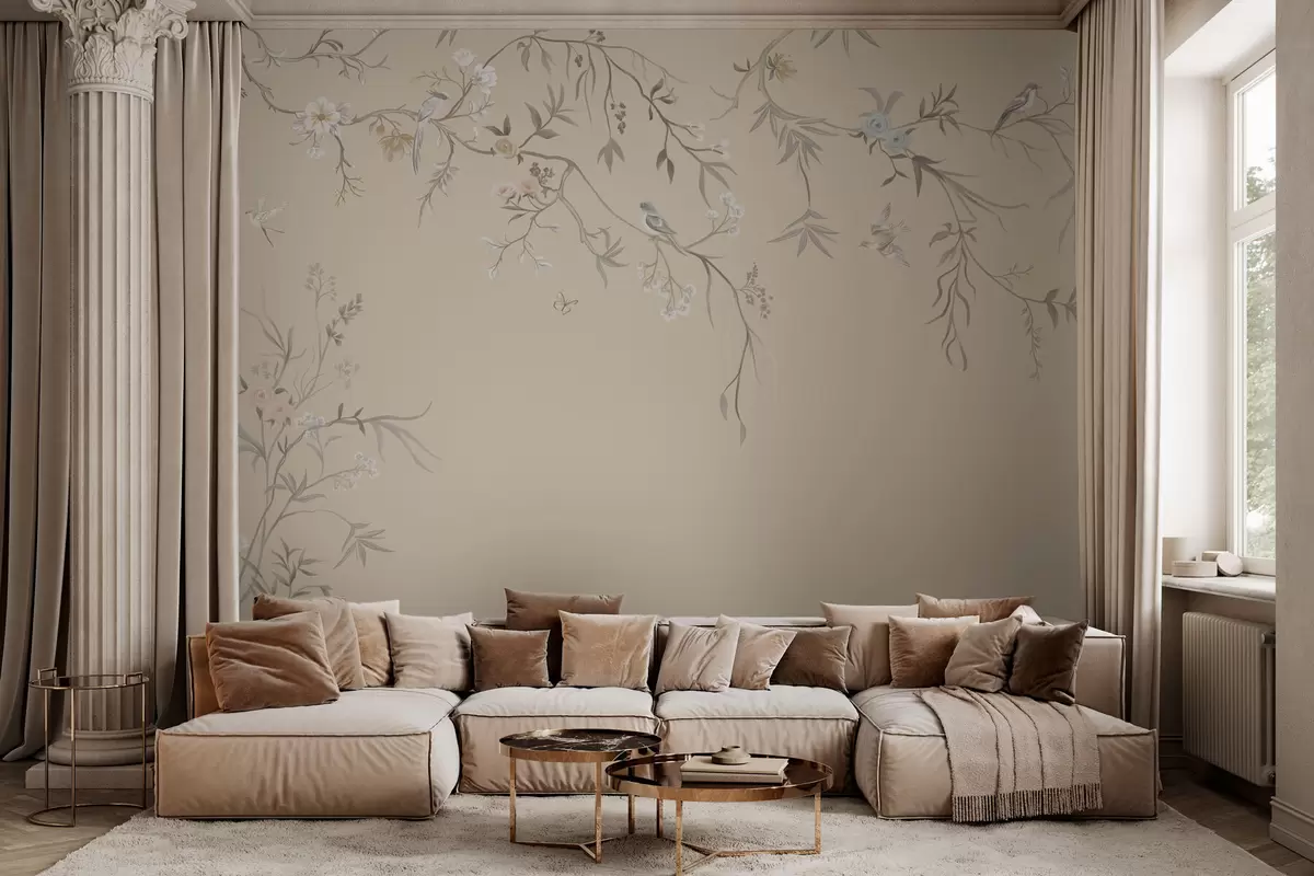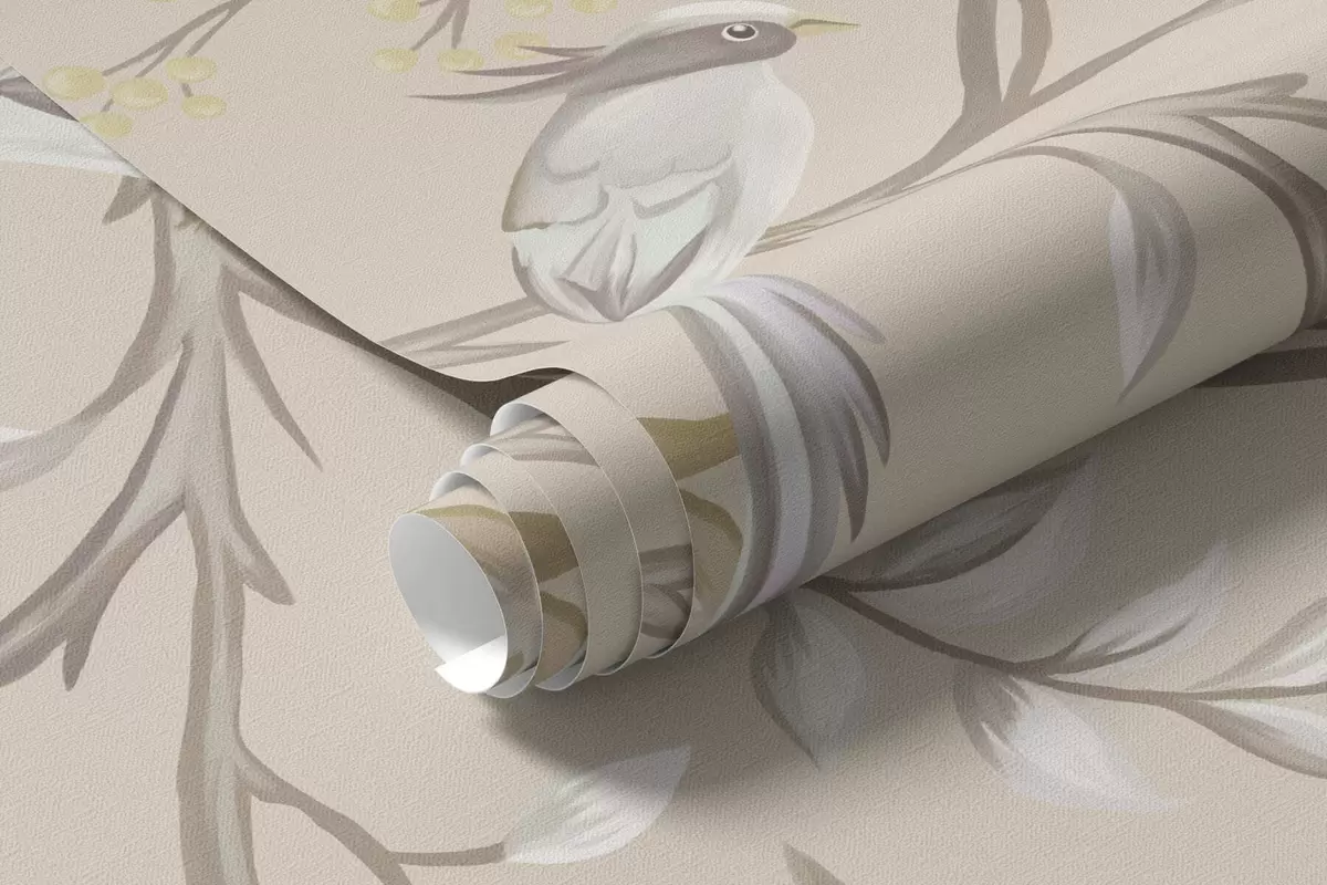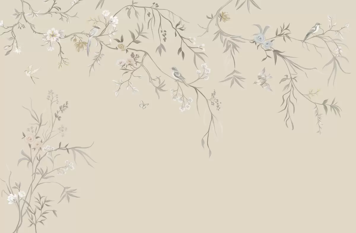 Fototapetes Gaiši ziedi un putni uz pasteļtoņa fona Nr. w05127v2