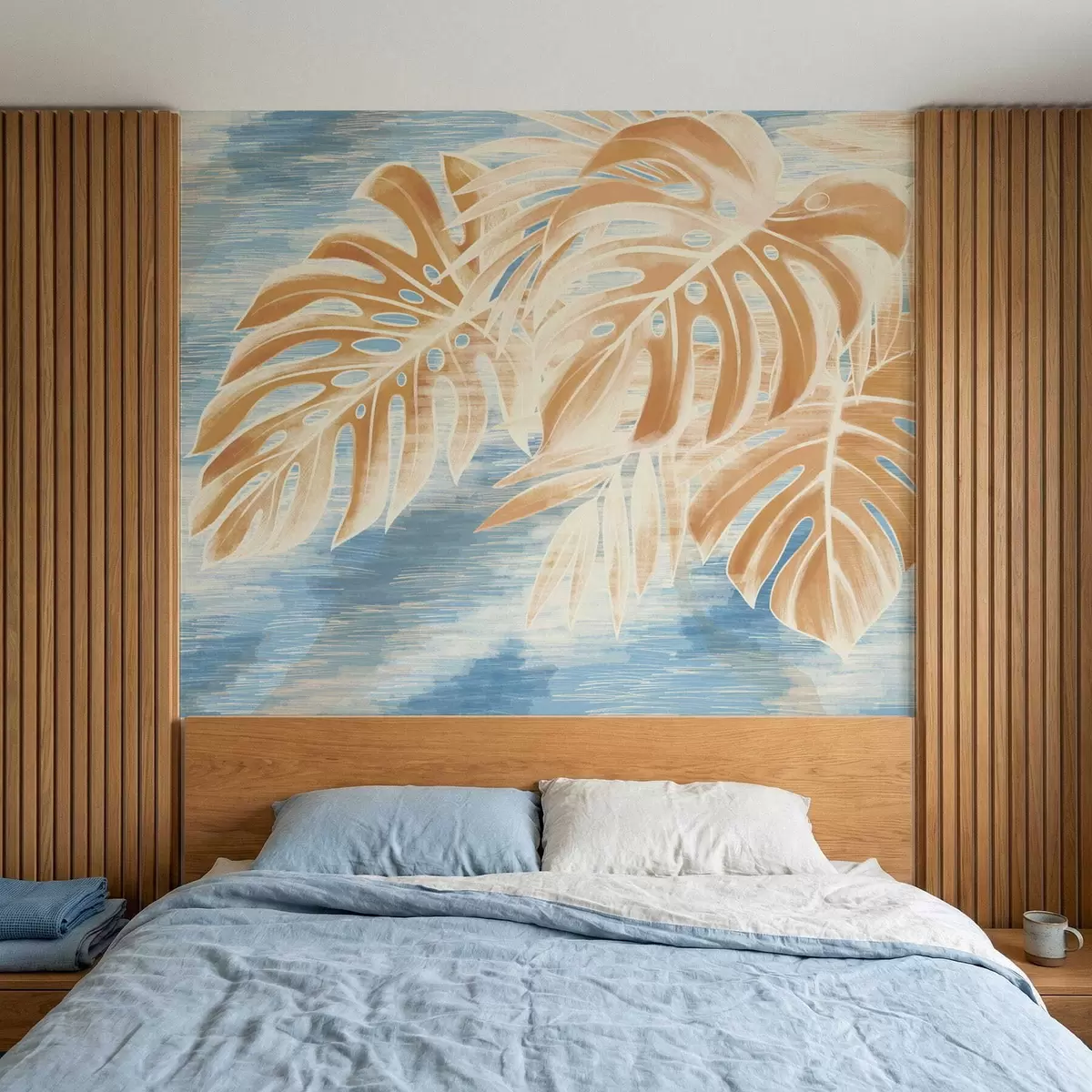 Fototapetes Lapas gaišos smilškrāsas toņos uz zila fona Nr. w05130v1