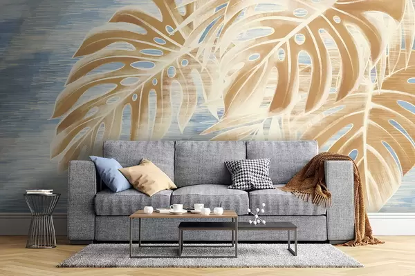 Fototapetes Lapas gaišos smilškrāsas toņos uz zila fona w05130v1