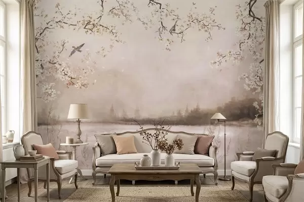 Fototapetes Ziedošas zaras virs rāmā ezera ar putniem miglā Nr. w05155v1
