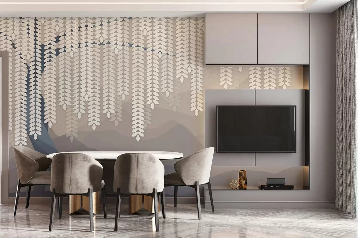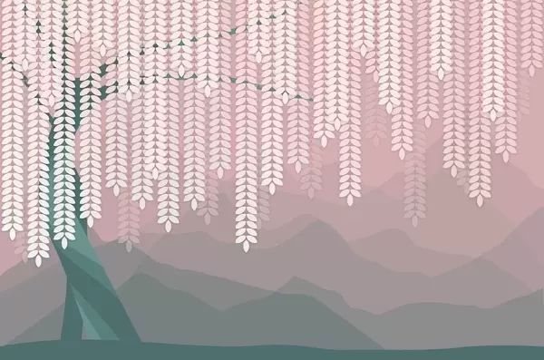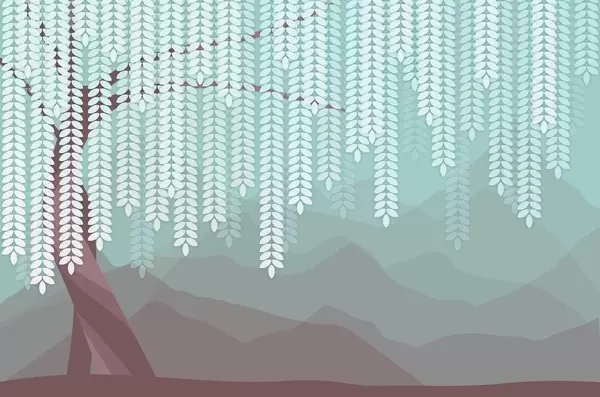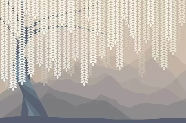 Fototapetes stilizēts vītols ar nokarājošām lapām uz minimālisma stila kalnu fona smilškrāsas un zilsarkanā toņos Nr. w05232