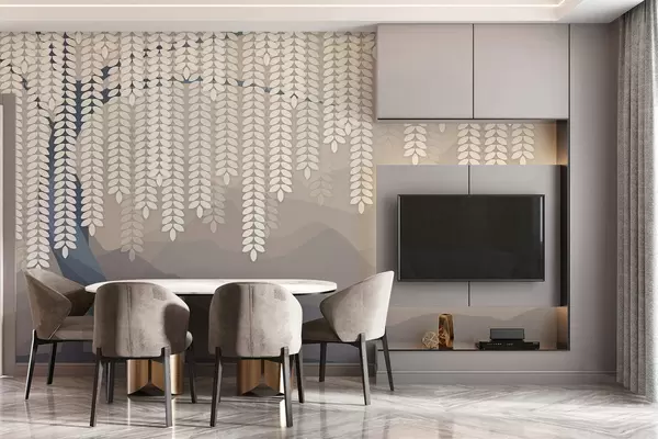 Fototapetes stilizēts vītols ar nokarājošām lapām uz minimālisma stila kalnu fona smilškrāsas un zilsarkanā toņos Nr. w05232