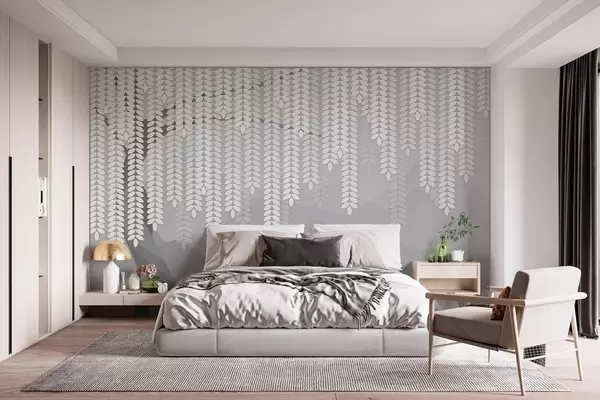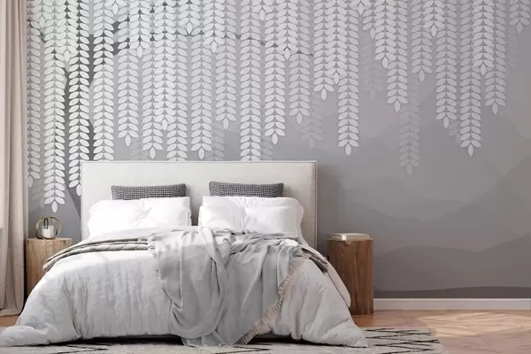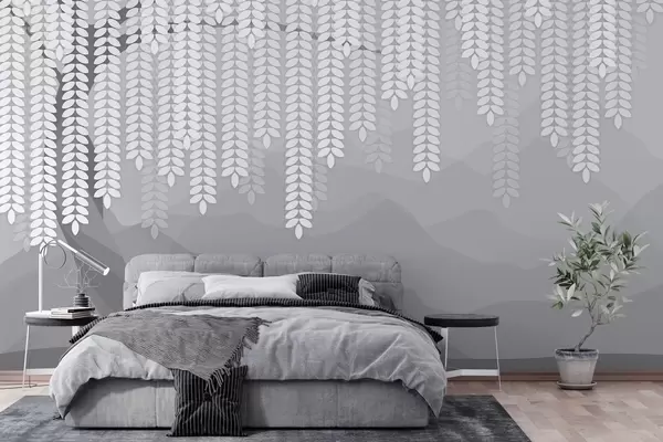 Fototapetes stilizēts vītols ar nokarājošām lapām uz minimālisma stila kalnu fona pelēkās toņos Nr. w05232v3