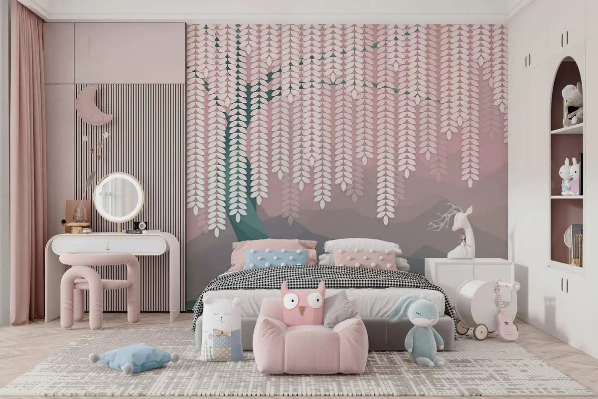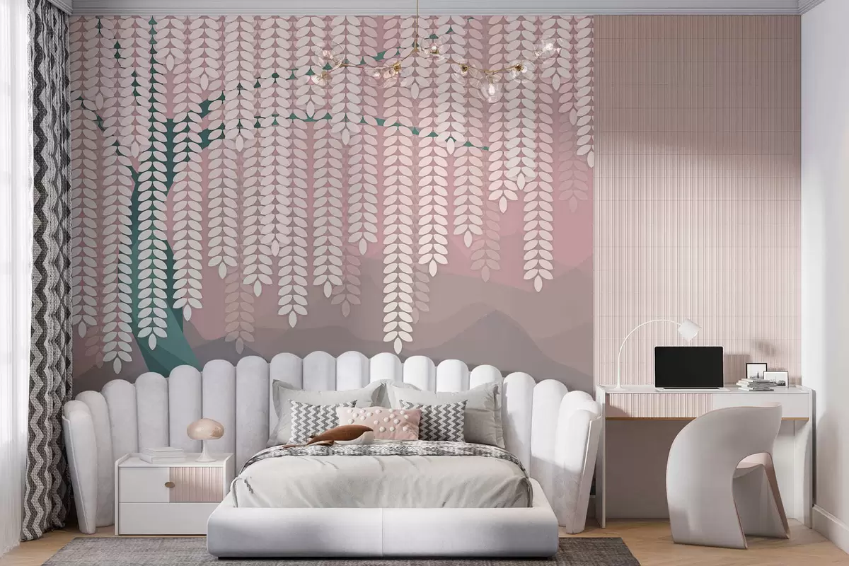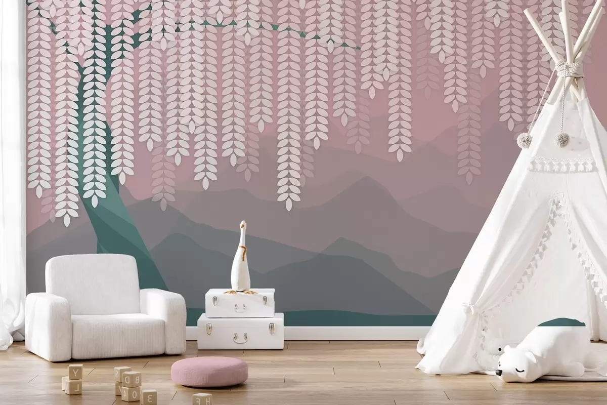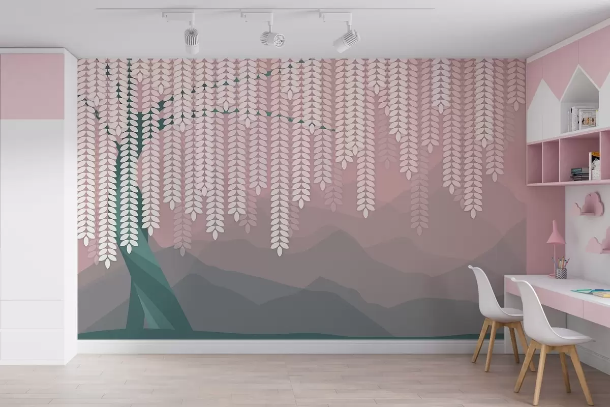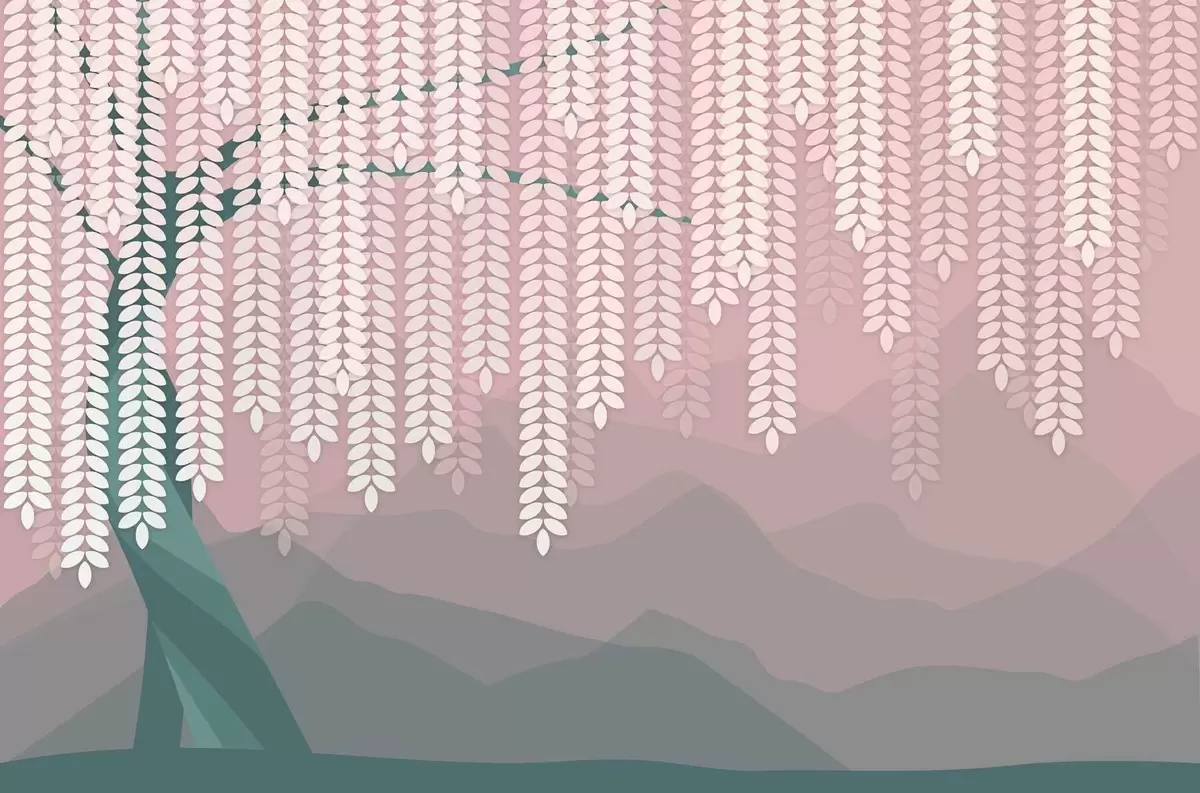 Fototapetes stilizēts vītols ar nokarājošām lapām uz minimālisma stila kalnu fona rozā un tumši zaļos toņos Nr. w05232v4