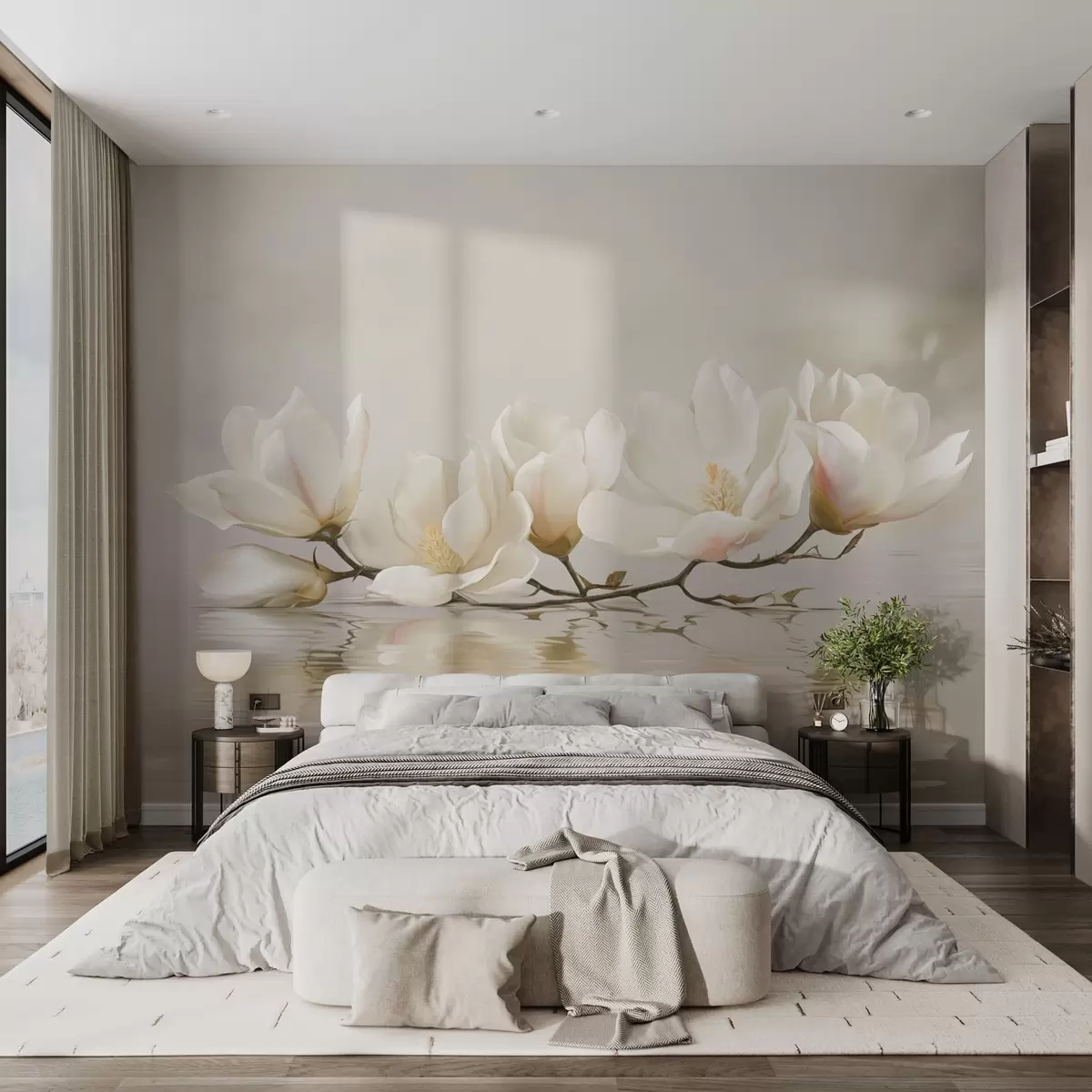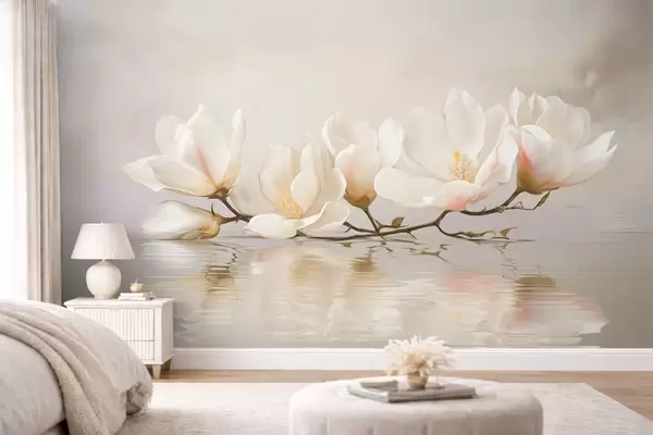 Fototapetes Gaiši magnolijas ziedi uz zariem virs ūdens atspulga Nr. w05353