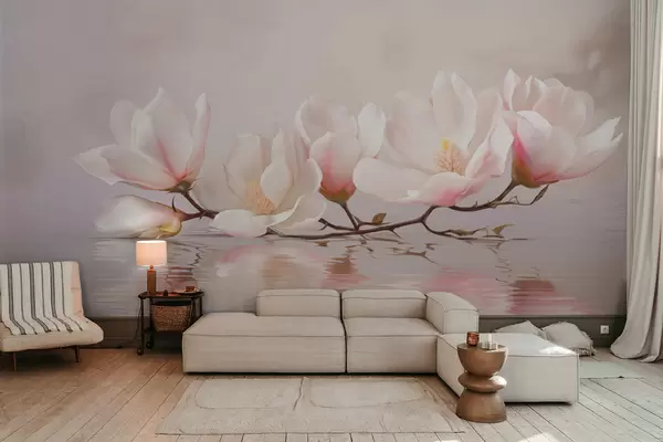 Fototapetes Magnolijas zars ar ziediem virs mierīga ūdens atspoguļojuma Nr. w05353v1