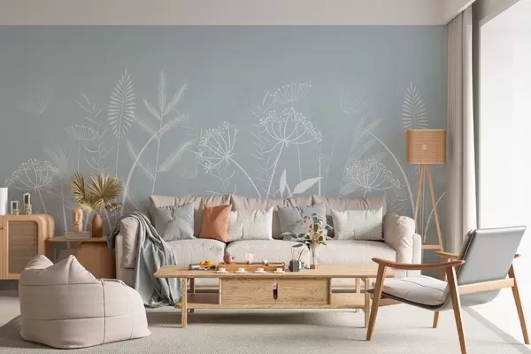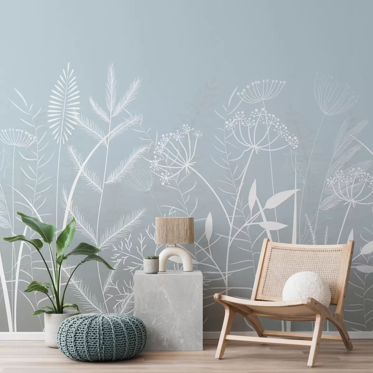 Fototapetes delikāti, ar rokām gleznoti savvaļas zāles stiebri un ziedi uz pelēkzila fona Nr. w05383