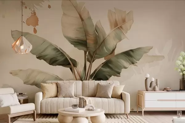 Fototapetes liels, gleznains banānu lapu klāsts ar retro stilā veidotiem krāsu plankumiem Nr. w05384