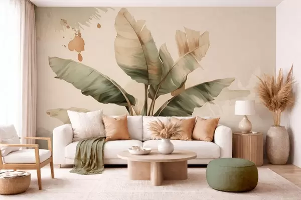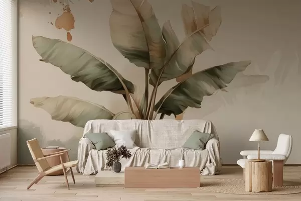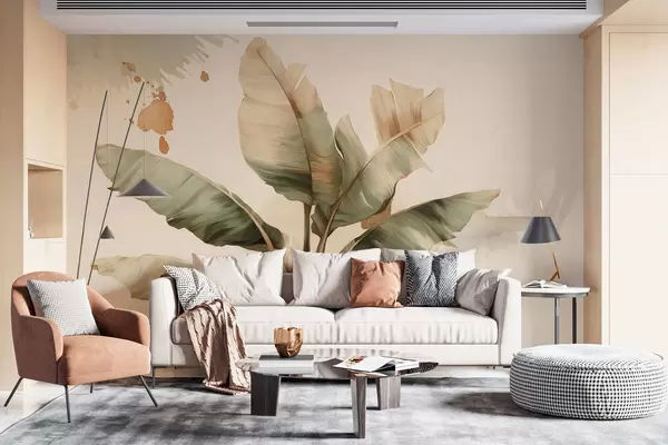 Fototapetes liels, gleznains banānu lapu klāsts ar retro stilā veidotiem krāsu plankumiem Nr. w05384