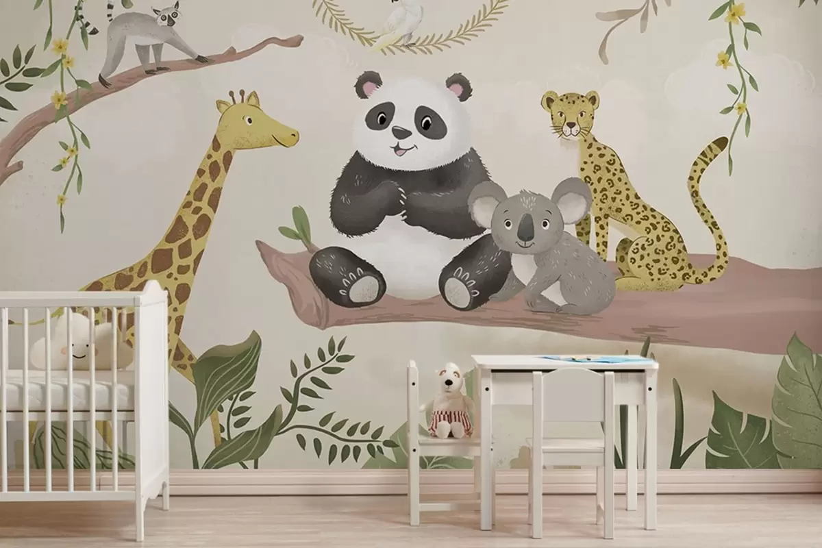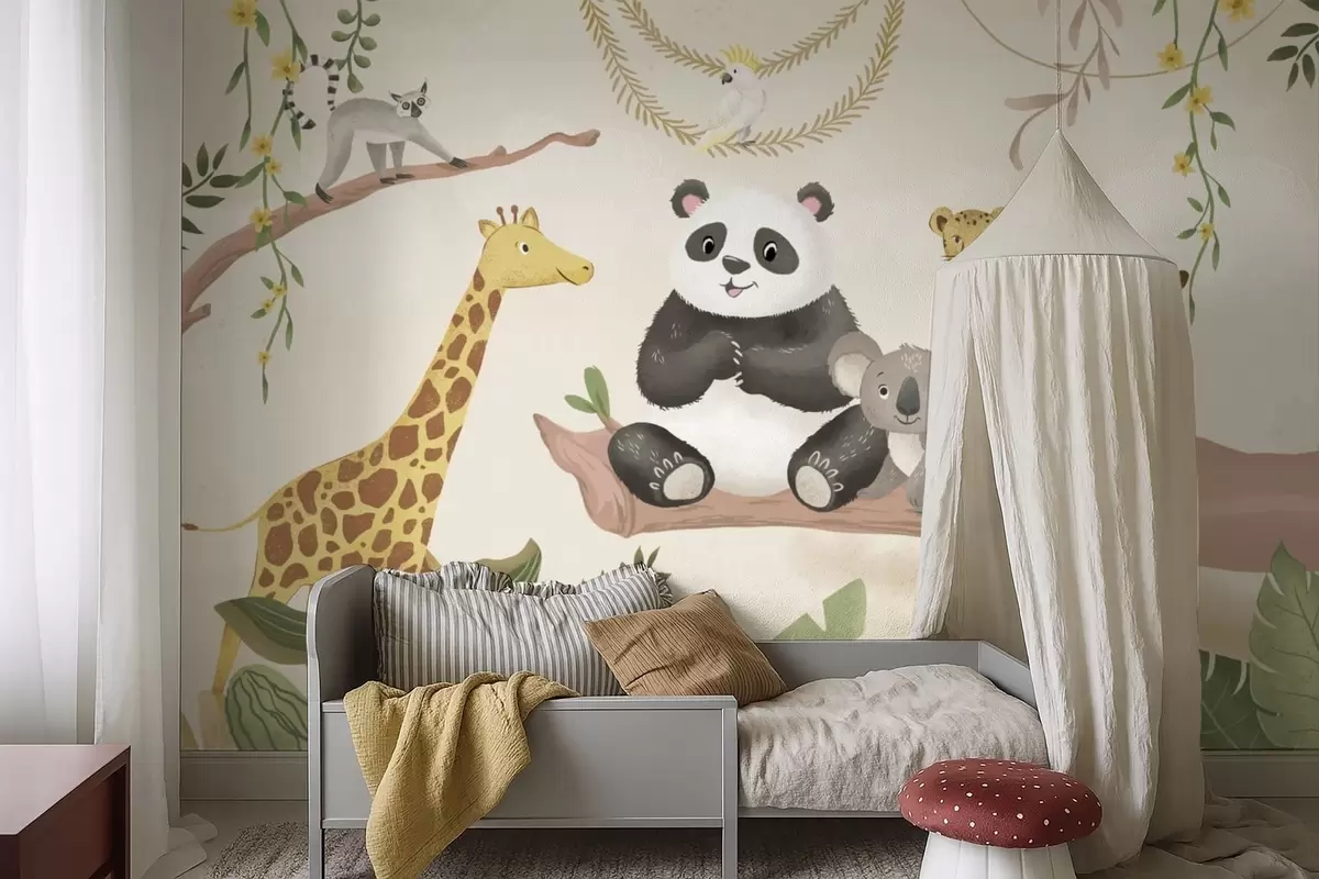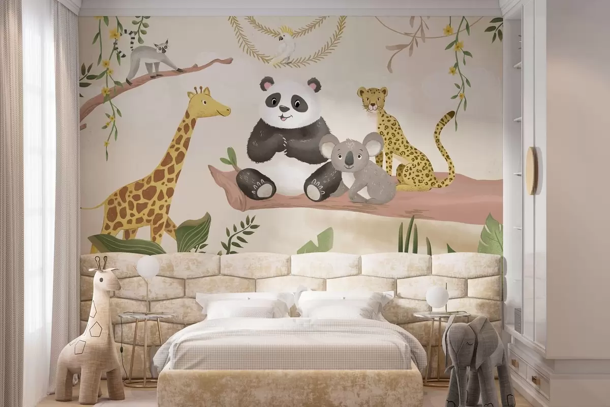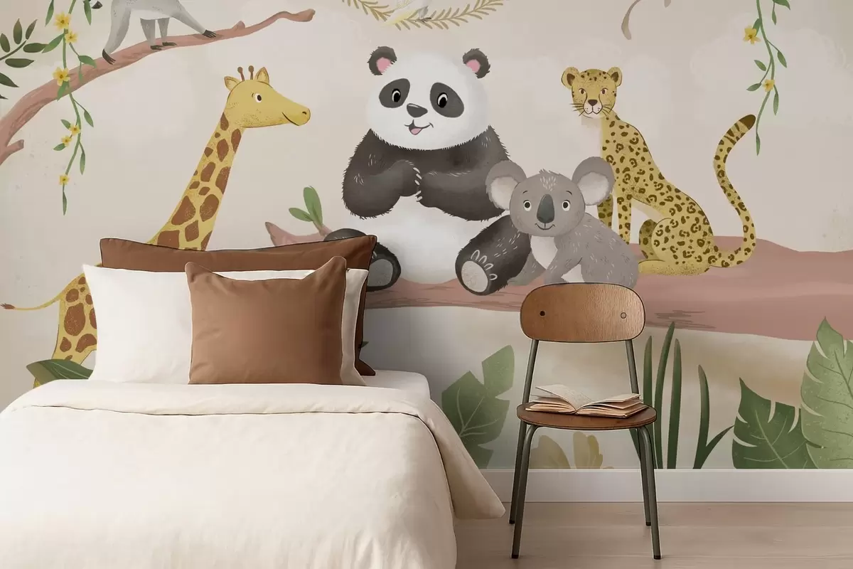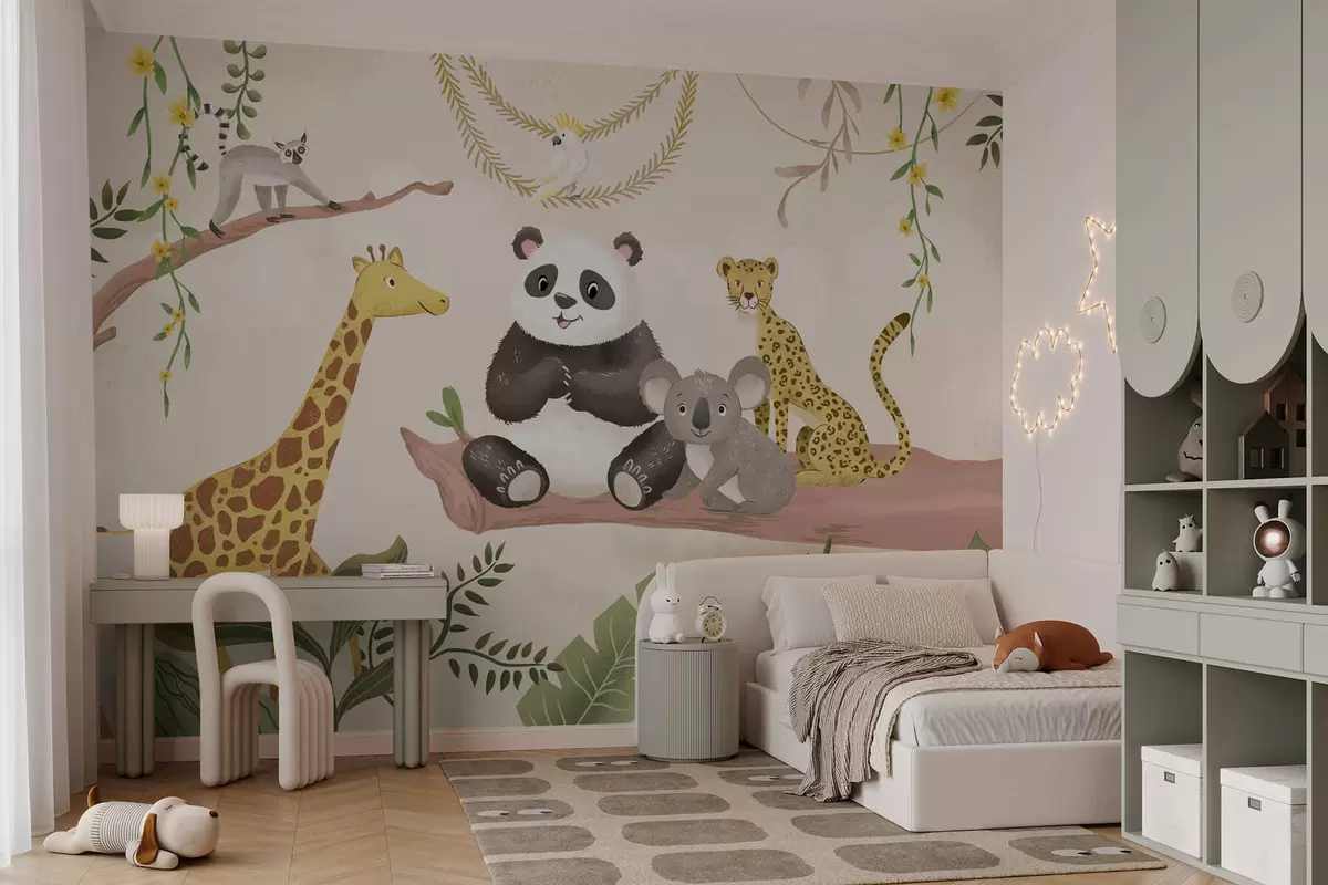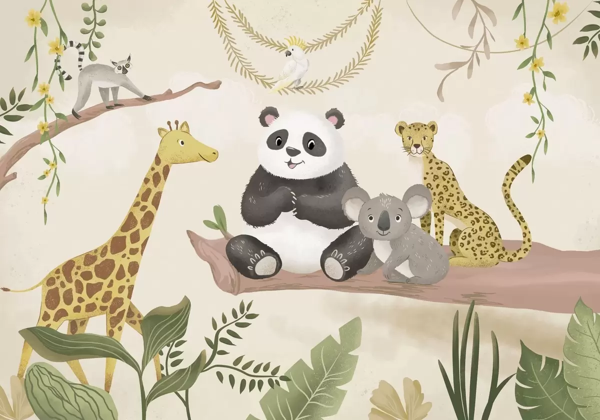 Fototapetes Mīlīgi džungļu dzīvnieki uz zara starp augiem Nr. w05393