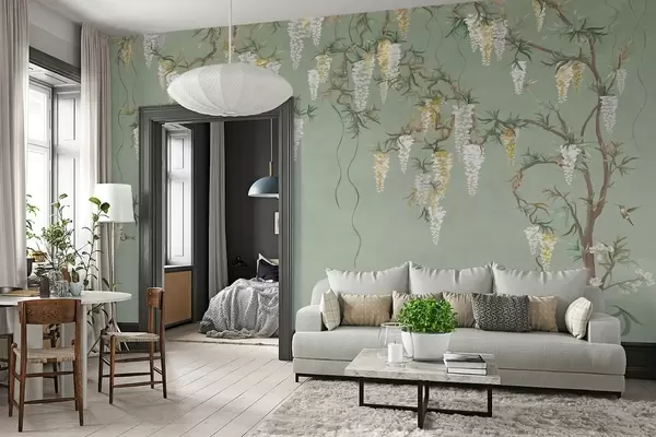Fototapetes Ziedošas zaras ar baltiem ziediem un putniem uz zaļā fona Nr. w05394