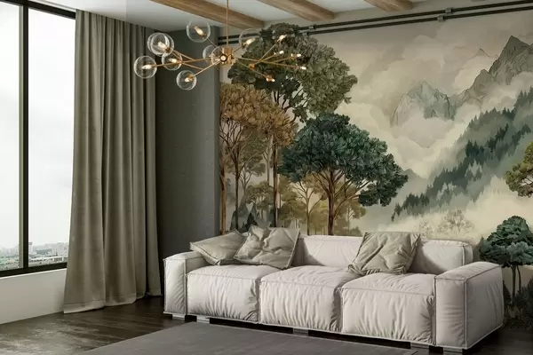 Fototapetes Mežs ar augstiem kokiem miglas apklātos kalnos Nr. w05410