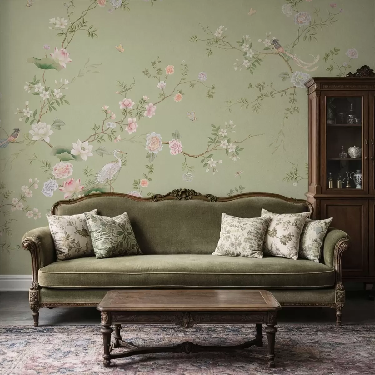 Fototapetes Ziedošas zaras ar putniem uz gaiši zaļā fona Nr. w05416
