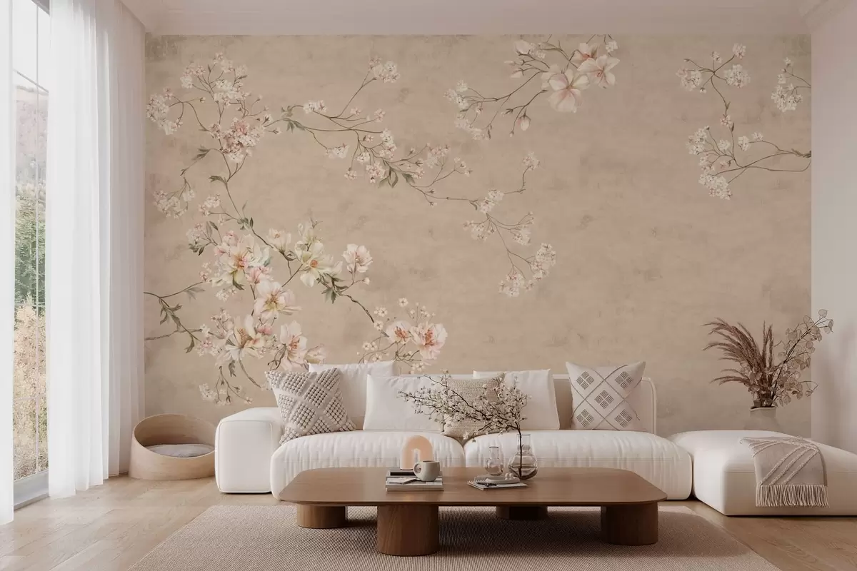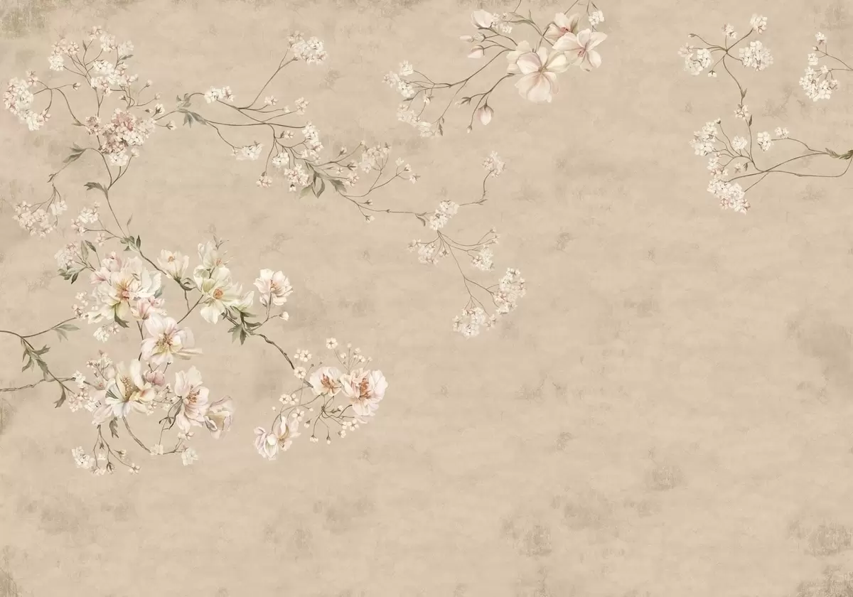 Fototapetes Ziedu motīvi ķīniešu stilā uz siltā smilškrāsas fona Nr. w05427v2