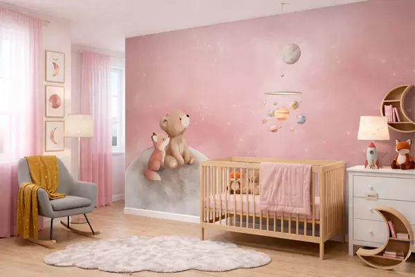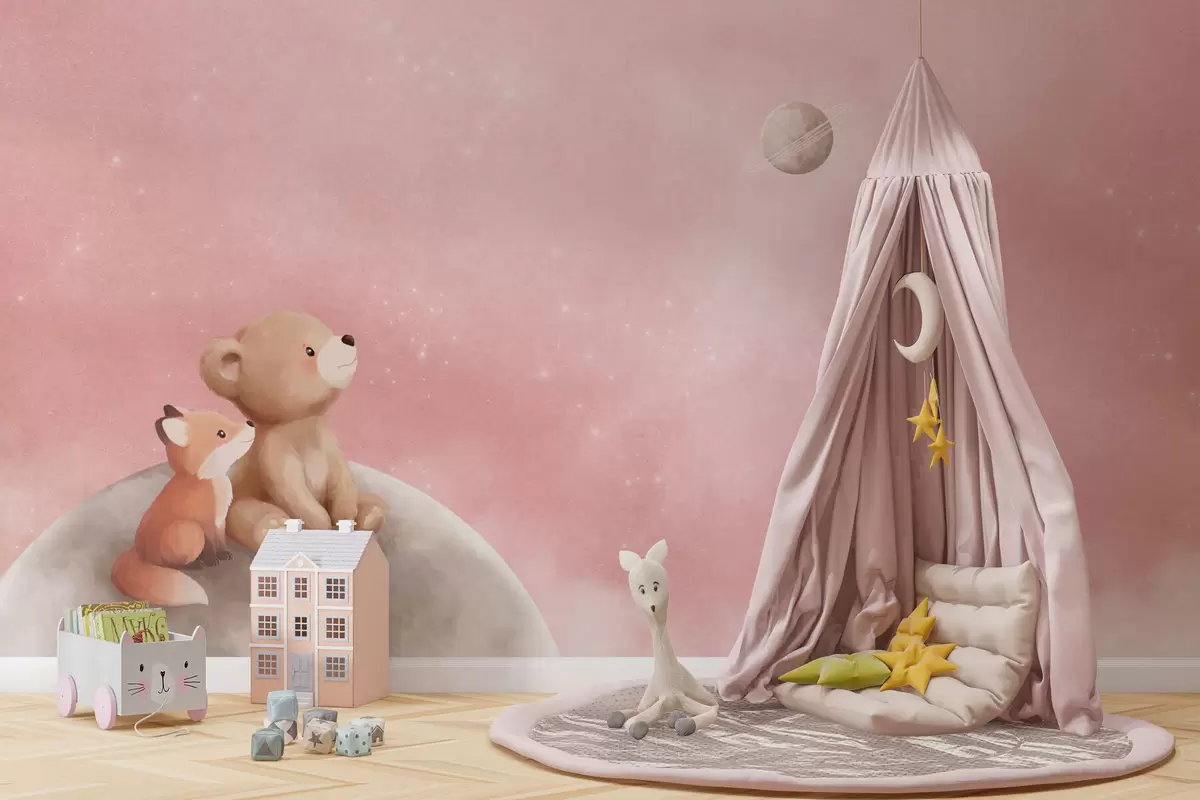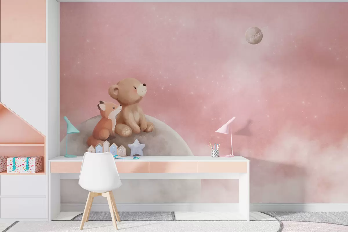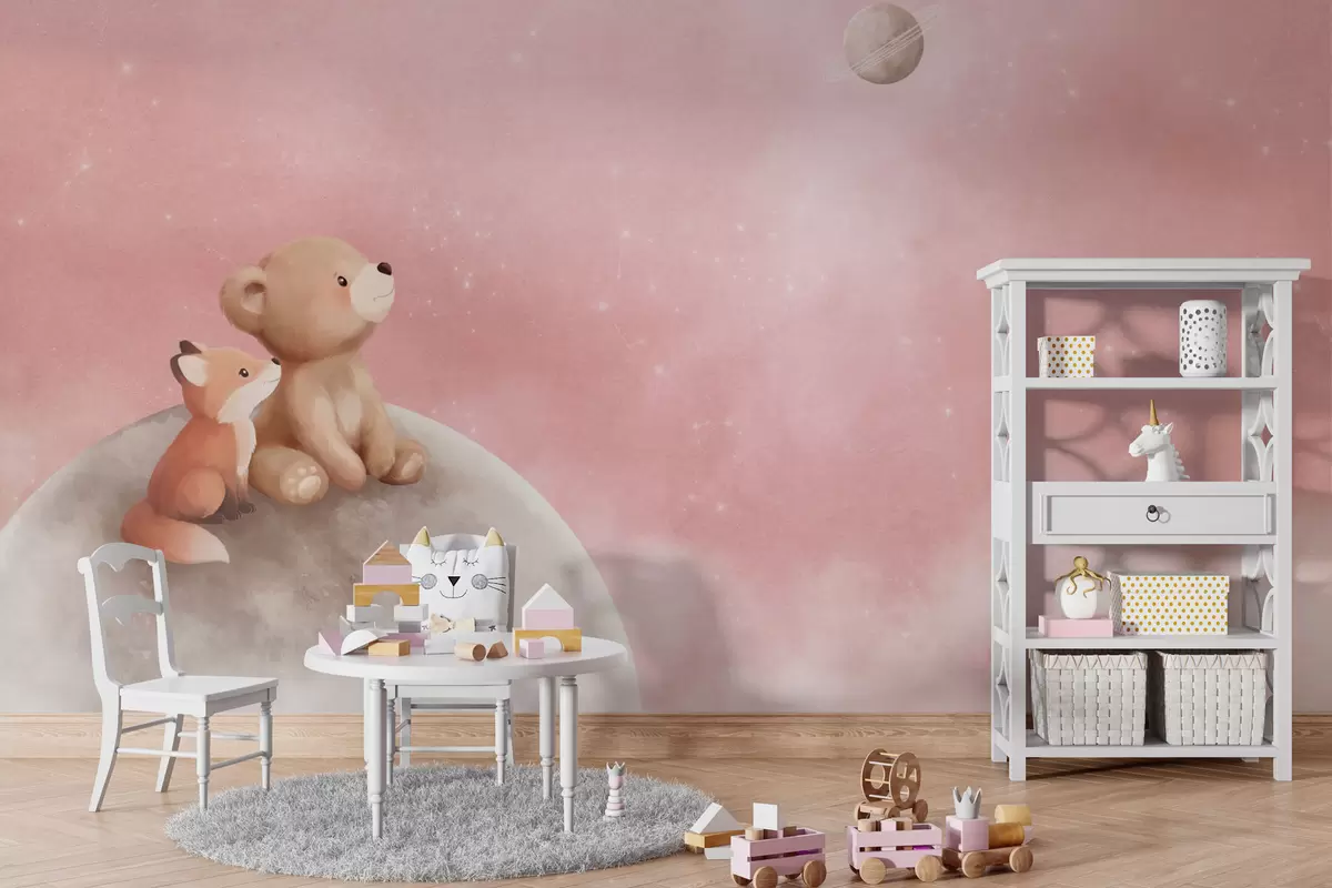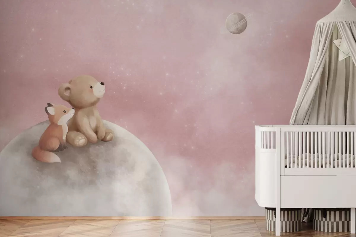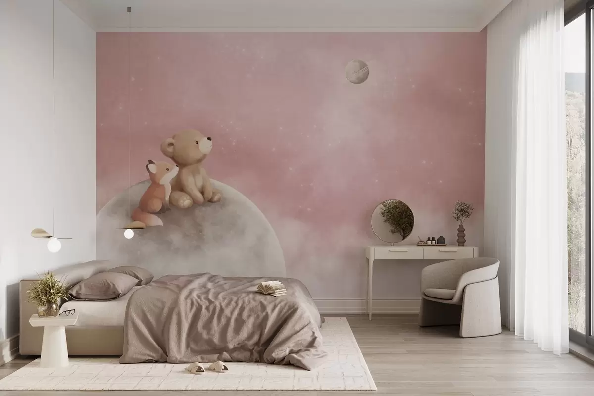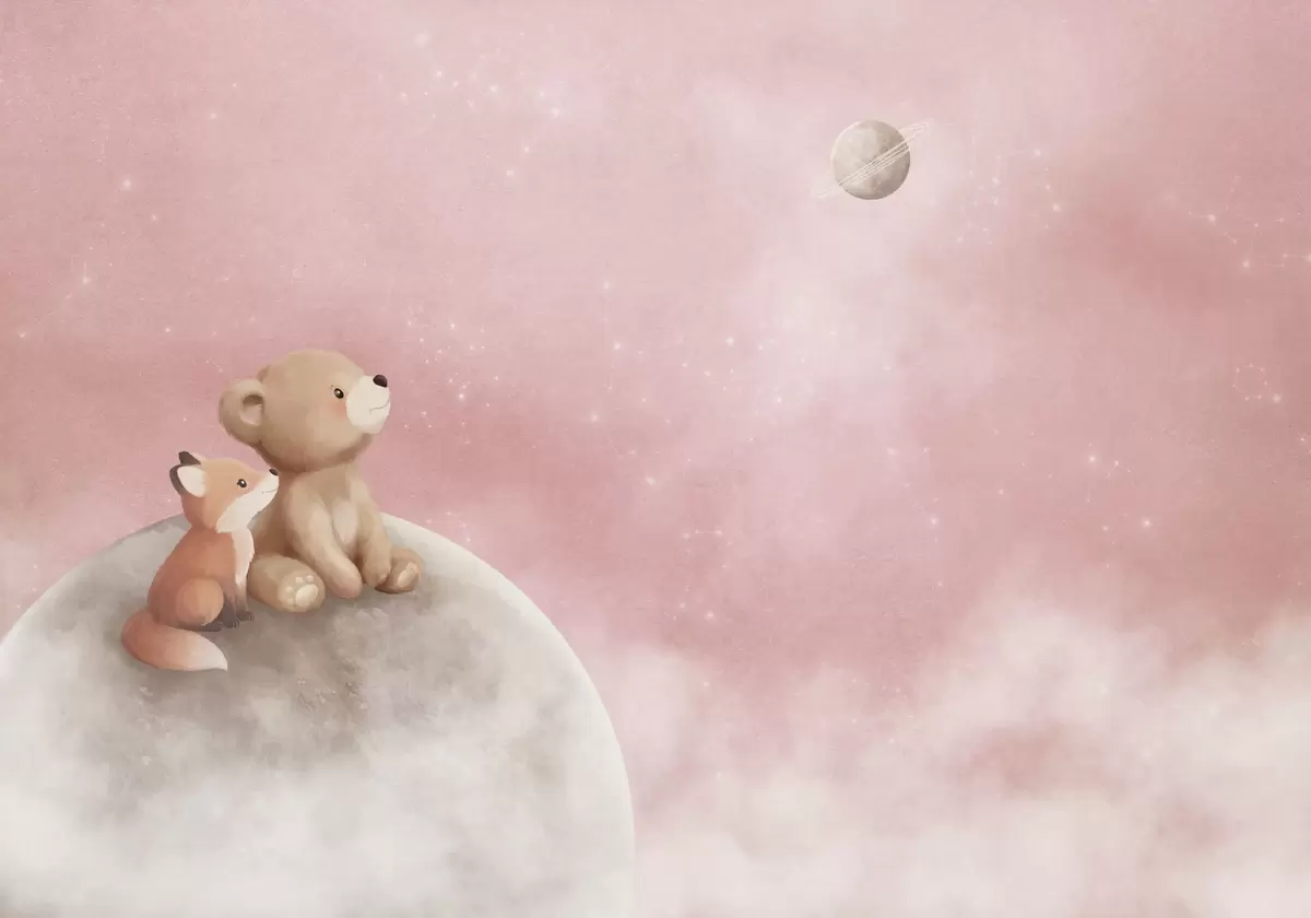 Fototapetes Pastelkrāsu ilustrācija ar lāci un lapsu uz mēness fona rozā debesīs Nr. w05431v2