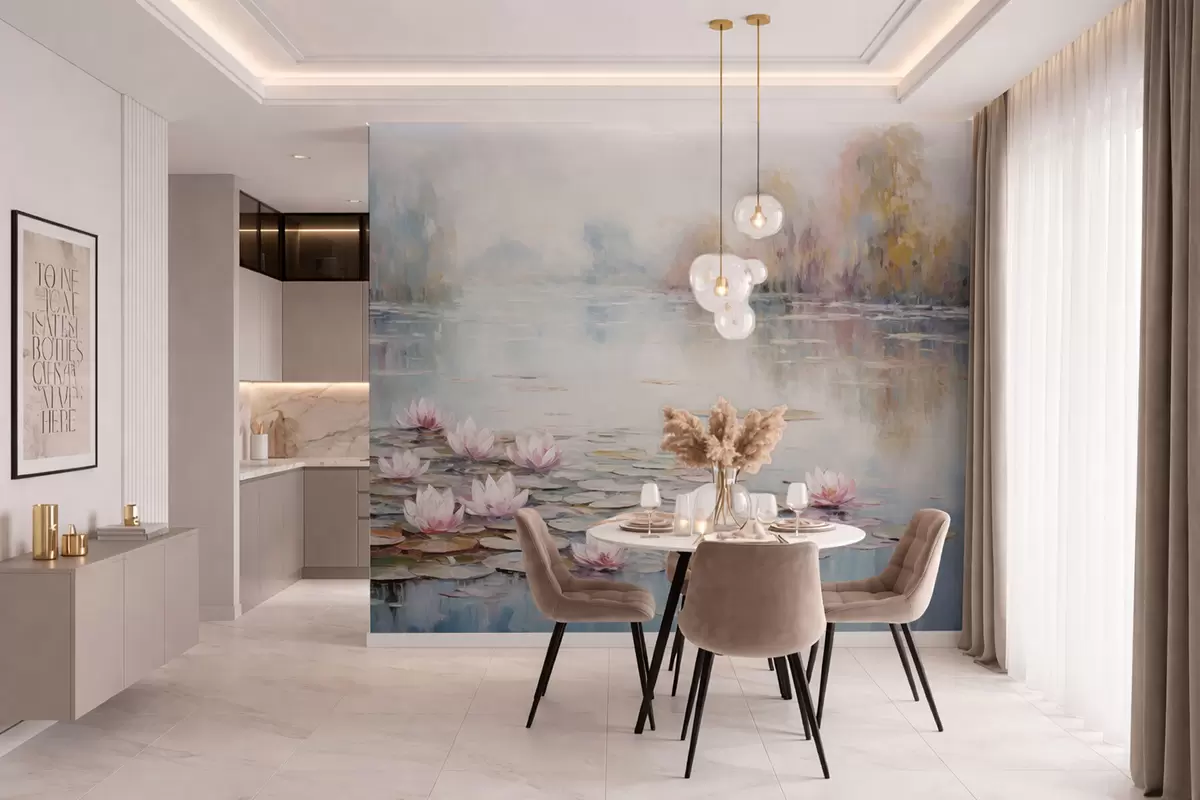 Fototapetes Impresionisma stila ezers ar ūdensrožēm un maigu gaismu Nr. w05515