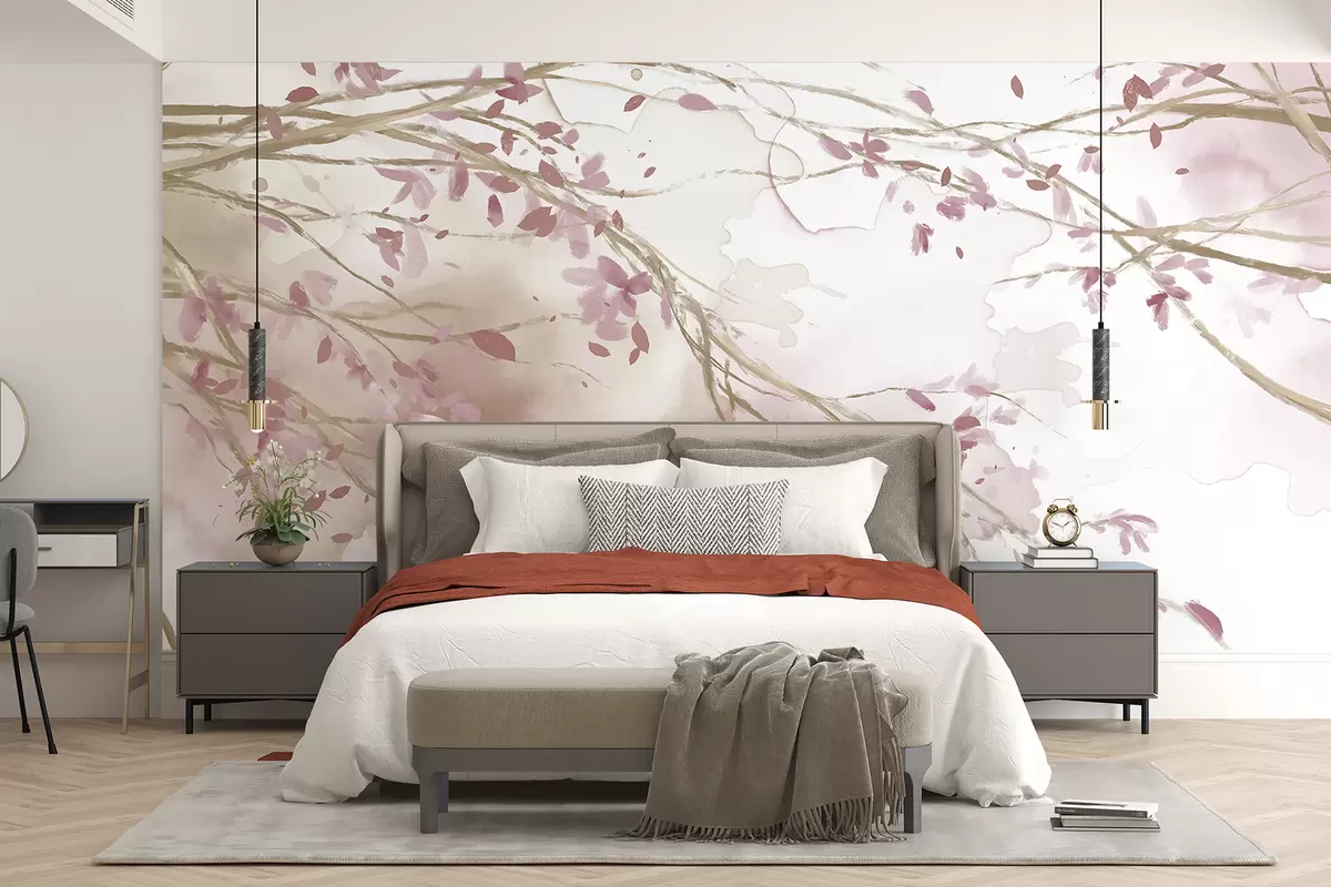 Fototapetes Smalki rozā un balti ziedu zari ar mīkstu, izplūdušu akvareļa fonu Nr. w07919v1