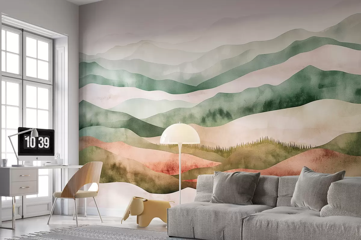 Fototapetes Akvareļu kalnu ainavas, mežs, daba, zaļas un bēšas krāsas Nr. w07950v1