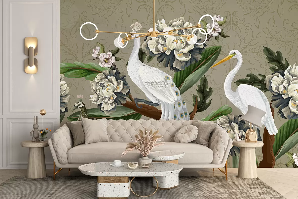 Fototapetes Baltu pāvu pāris ar garām astēm, ko ieskauj lieli balti peonijas ziedi un sulīgi zaļi zaļumi Nr. w07975