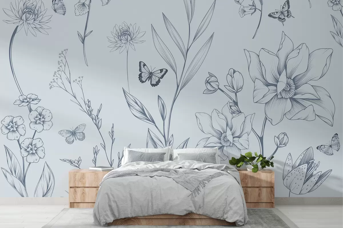 Fototapetes Boho vienkrāsaini ziedi un tauriņi zilā krāsā Nr. w08088v2