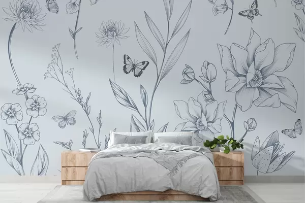 Fototapetes Boho vienkrāsaini ziedi un tauriņi zilā krāsā Nr. w08088v2