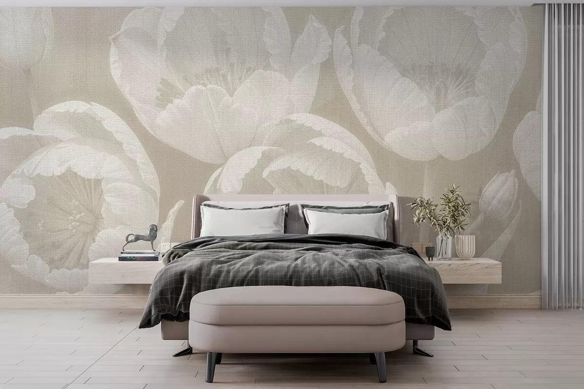Fototapetes Baltu tulpju zīmējums ar mīkstu, audekla teksturētu rozā izplūdušu fona minimālisma vienkrāsainu apdruku Nr. w08193v1