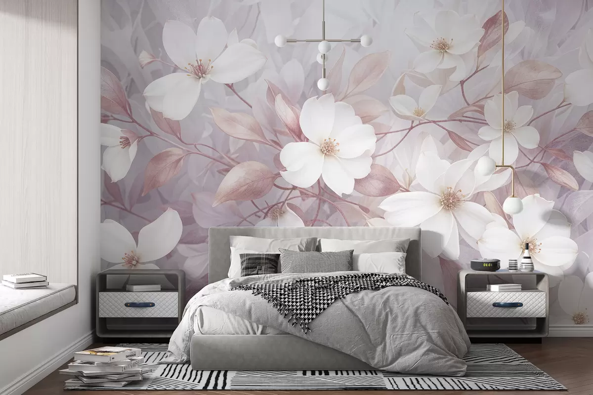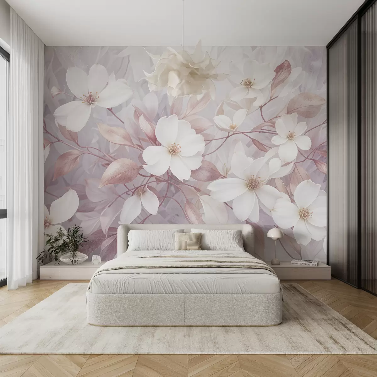 Fototapetes Smalki rozā un balti magnolijas ziedi, kas zied uz mīkstiem, izplūdušiem zariem uz bāla fona Nr. w08196