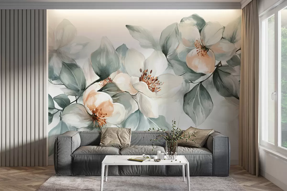 Fototapetes Smalki balti un rozā magnolijas ziedi ar maigi zaļām lapām uz gaiša fona Nr. w08220