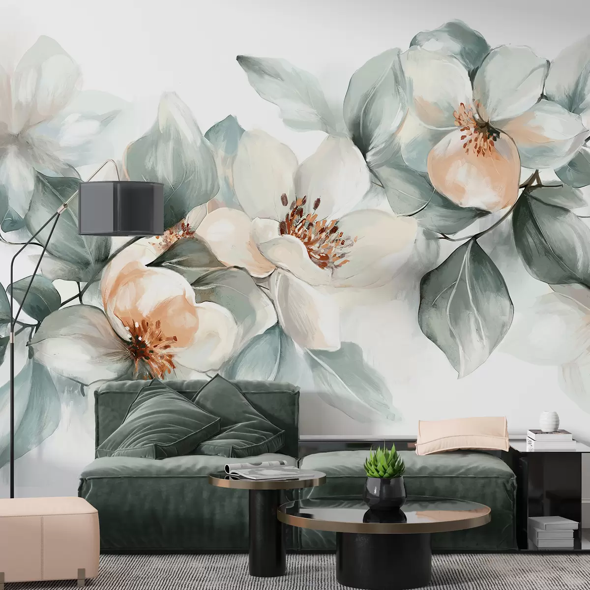 Fototapetes Smalki balti un rozā magnolijas ziedi ar maigi zaļām lapām uz gaiša fona Nr. w08220