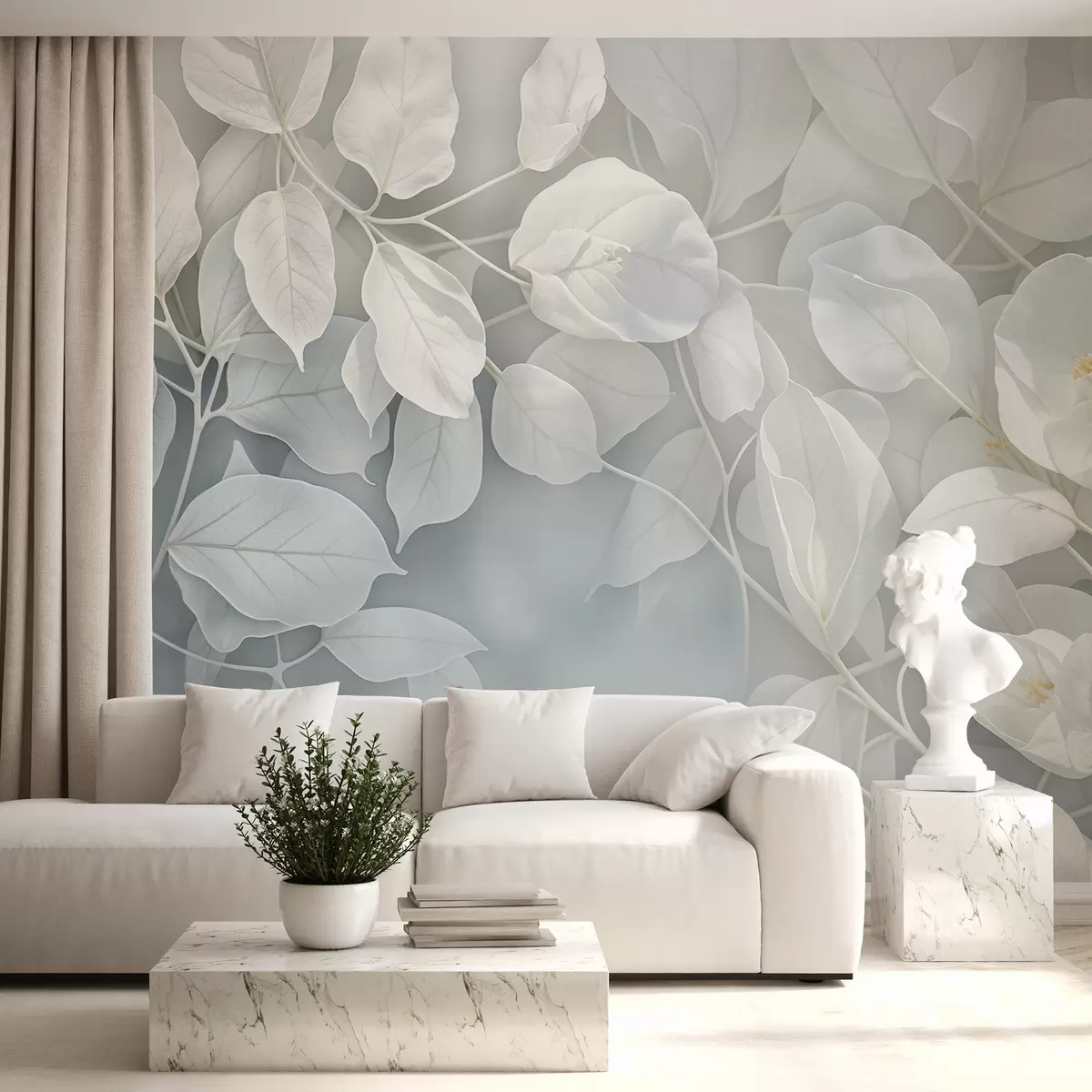Fototapetes Mīksti, maigi balti ziedi ar pelēkzaļām lapām uz izplūduša fona, radot mierīgu atmosfēru Nr. w08232