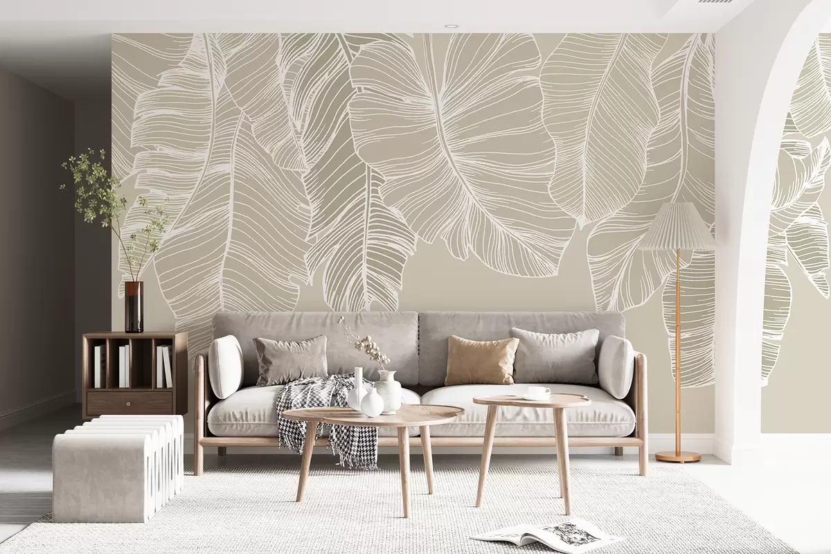 Fototapetes Baltas tropu ziedu lapas ar gaiši smilškrāsas fonu, minimālisma līniju mākslas dizains Nr. w08235