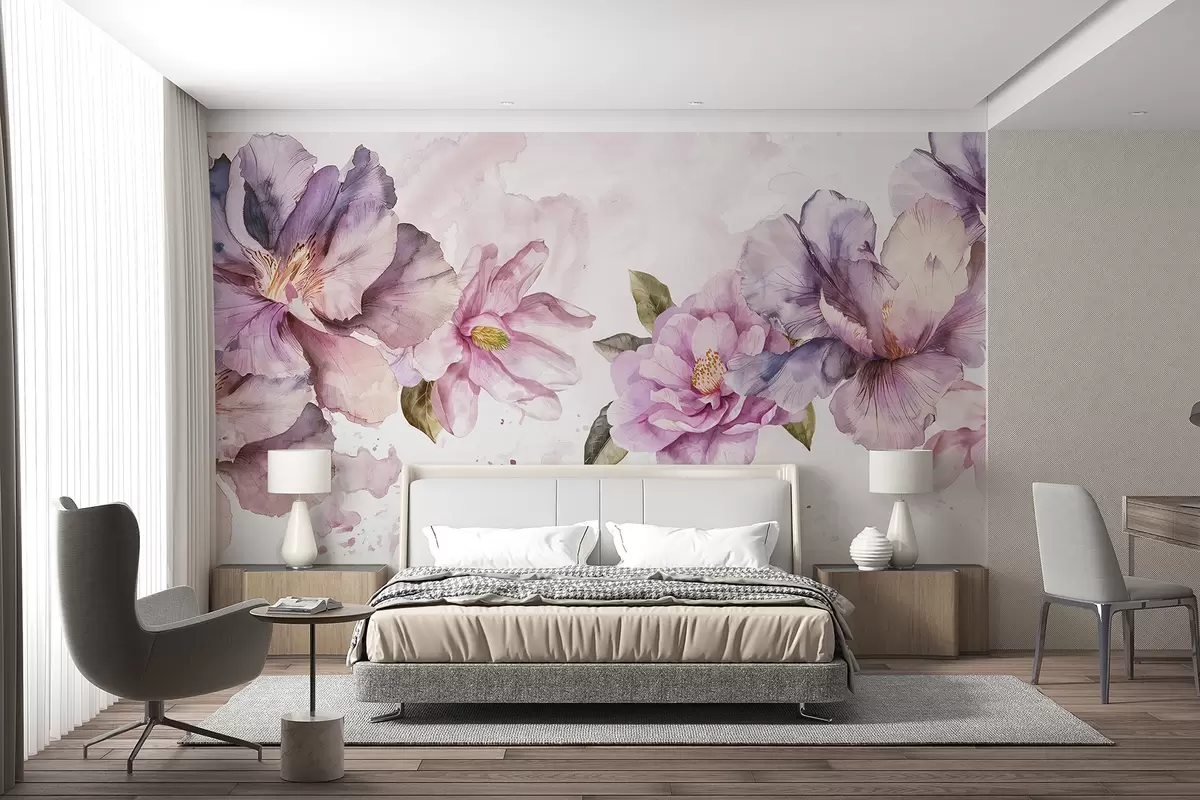 Fototapetes Smalki rozā un purpursarkani akvareļu ziedi ar maigām ziedlapiņām un zaļām lapām uz gaiša fona Nr. w08238