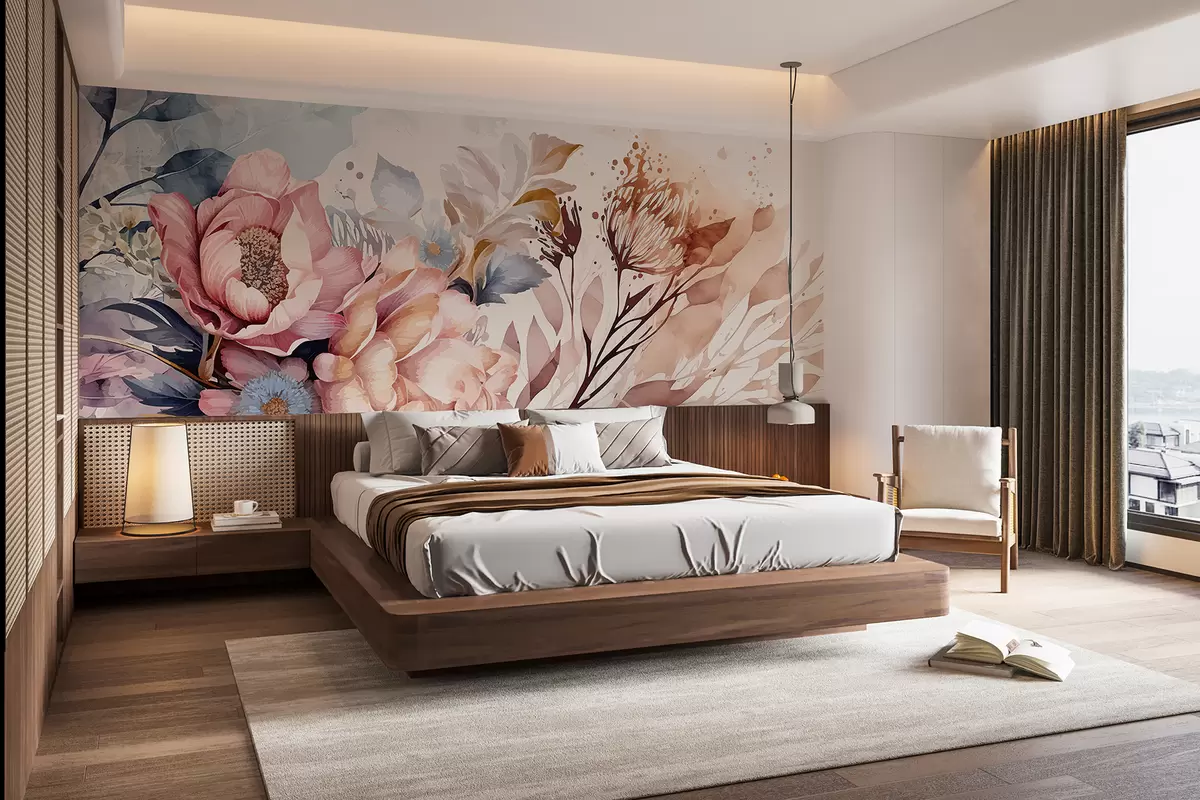 Fototapetes Lieli rozā un zili ziedi ar maigām ziedlapiņām, ko ieskauj mazāki ziedi uz akvareļa fona Nr. w08256