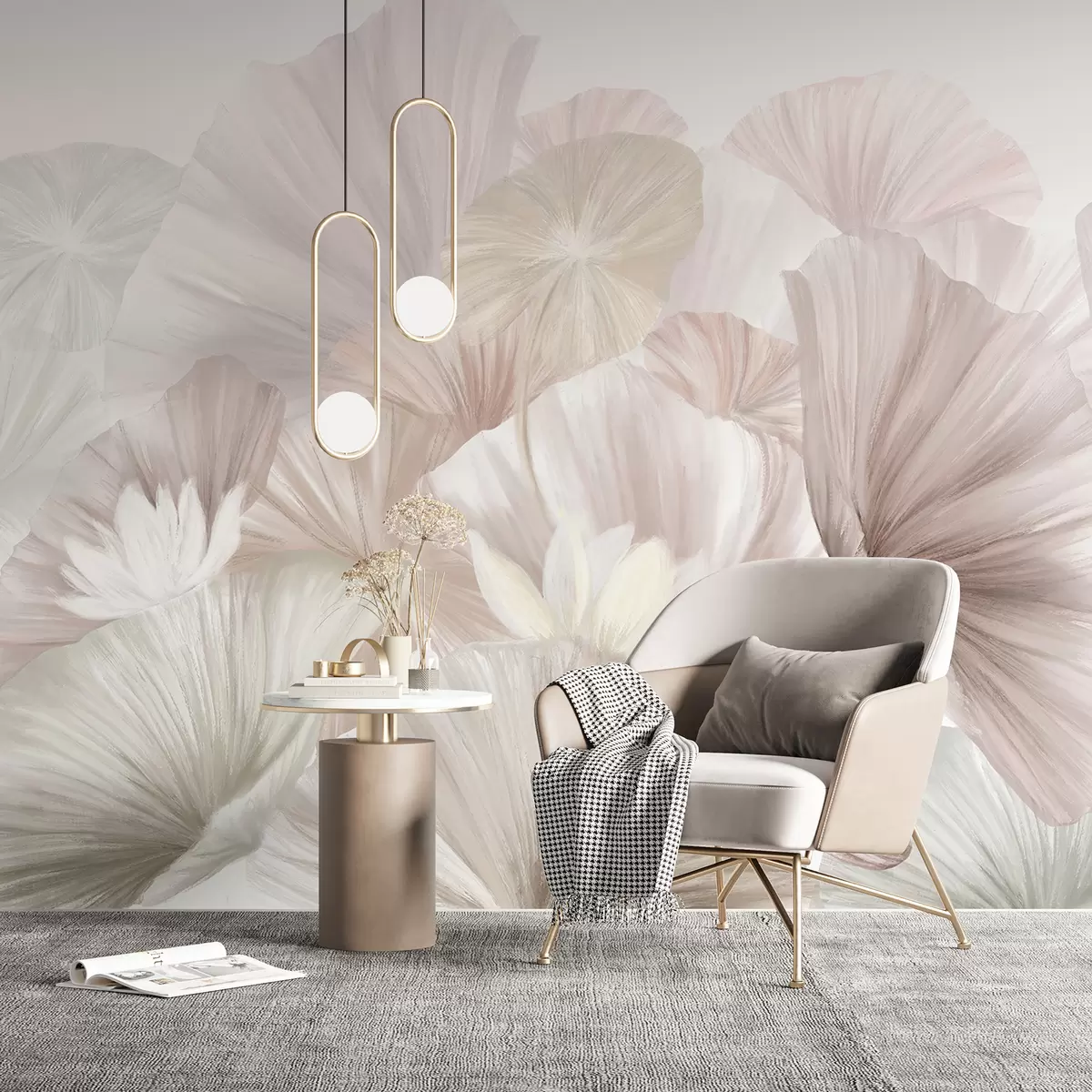 Fototapetes Delikātas rozā lotosa lapas ar baltiem ziediem ar maigiem, spalvotiem ziedlapiņām, kas sakārtotas dabas mākslas kompozīcijā Nr. w08265v1