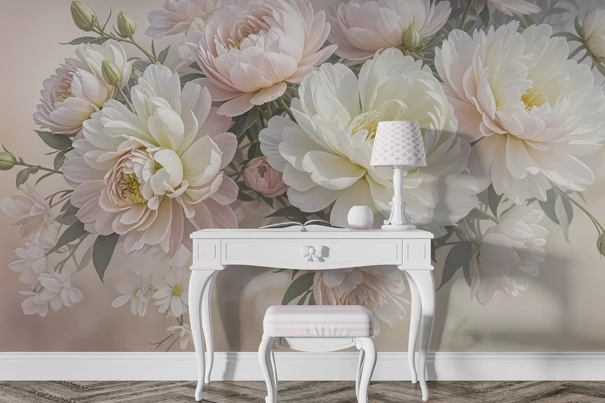 Fototapetes Sulīgu, pasteļkrāsu peoniju un citu ziedu pušķis uz maiga, izplūduša fona Nr. w08276