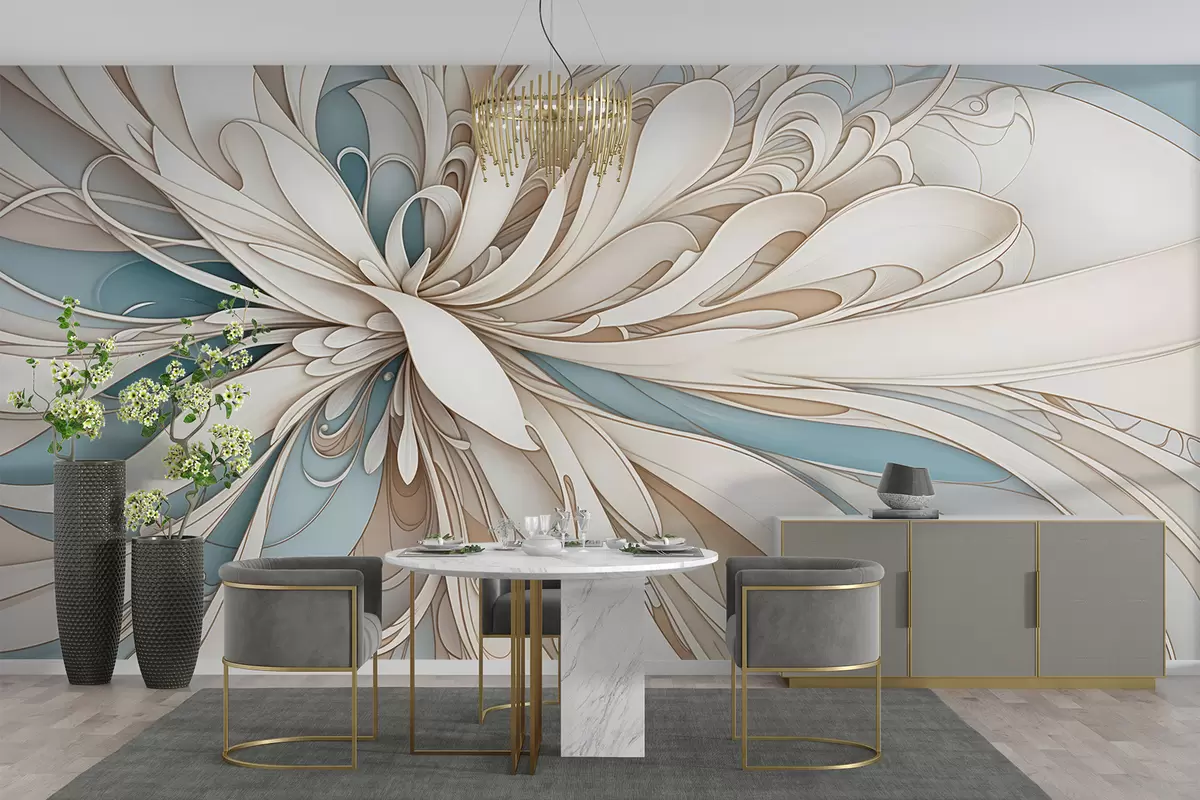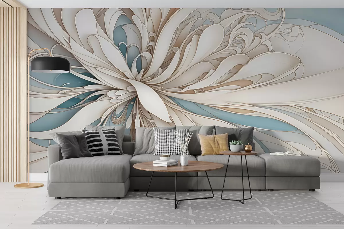 Fototapetes Abstraktais ziedu raksts ar virpuļojošām organiskām formām bēša, iedeguma un zilā krāsā ar gaišu fonu Nr. w08311