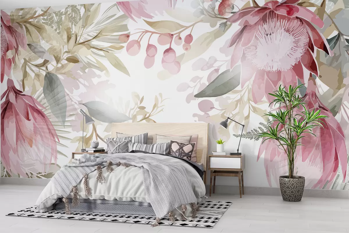 Fototapetes Lielas rozā un baltas caurspīdīgas proteas ar sulīgi zaļām lapām uz gaiša fona Nr. w08315
