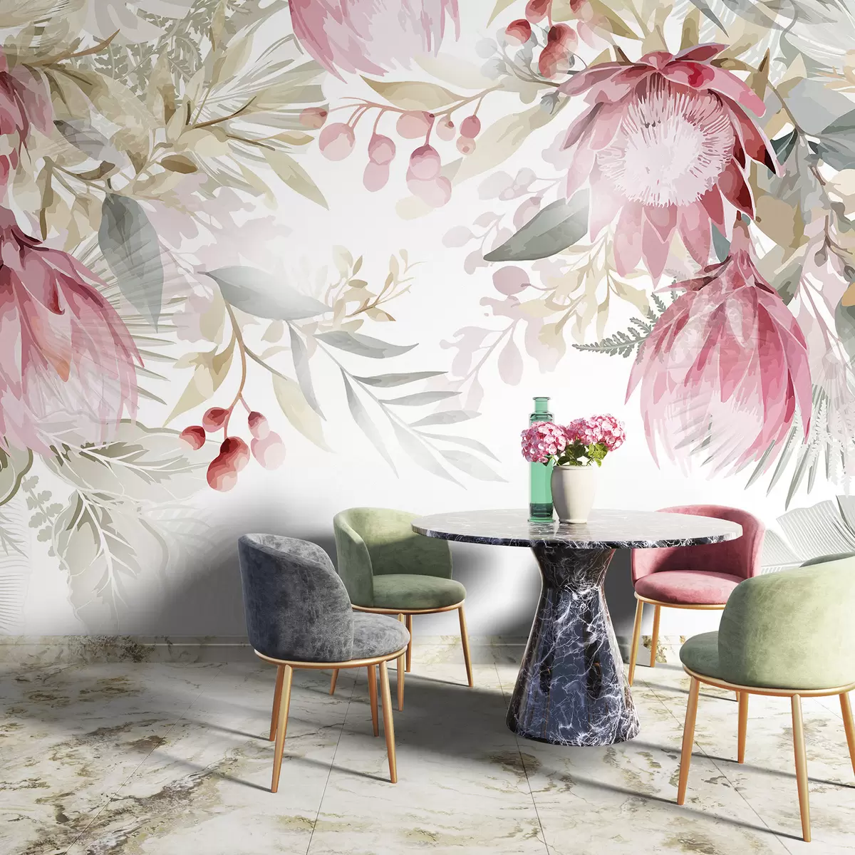 Fototapetes Lielas rozā un baltas caurspīdīgas proteas ar sulīgi zaļām lapām uz gaiša fona Nr. w08315