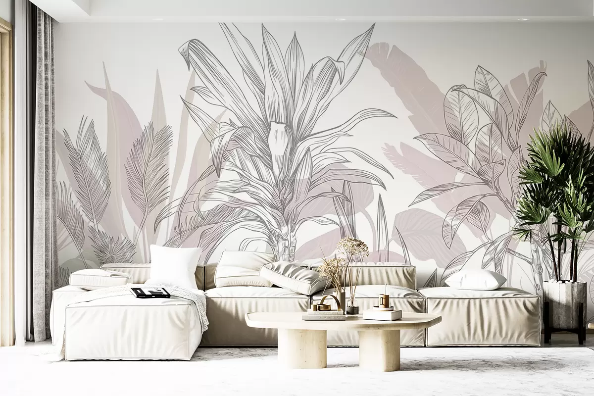 Fototapetes Tropu grafiskie augi ar lielām, sulīgām lapām un ziediem pelēkos un baltos toņos ar ziedu rozā siluetiem Nr. w08327v1