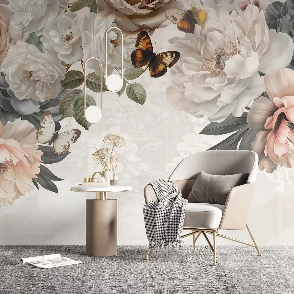 Fototapetes Lieli balti un rozā peoniju ziedi ar tauriņu, kas sēž uz viena no ziediem uz mīksta, neskaidra fona Nr. w08340
