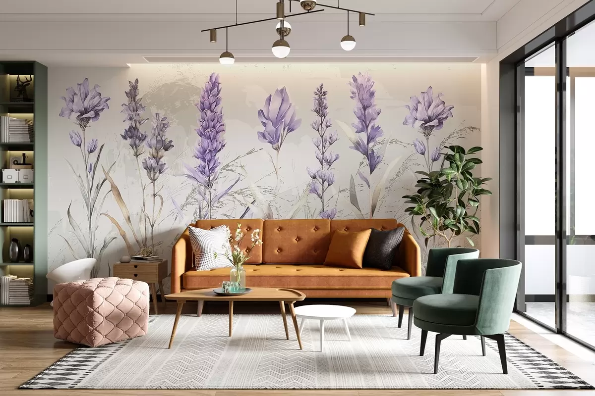Fototapetes Violetu akvareļu lavandas ziedu lauks ar mīkstu, izplūdušu, teksturētu smilškrāsas fonu Nr. w08346