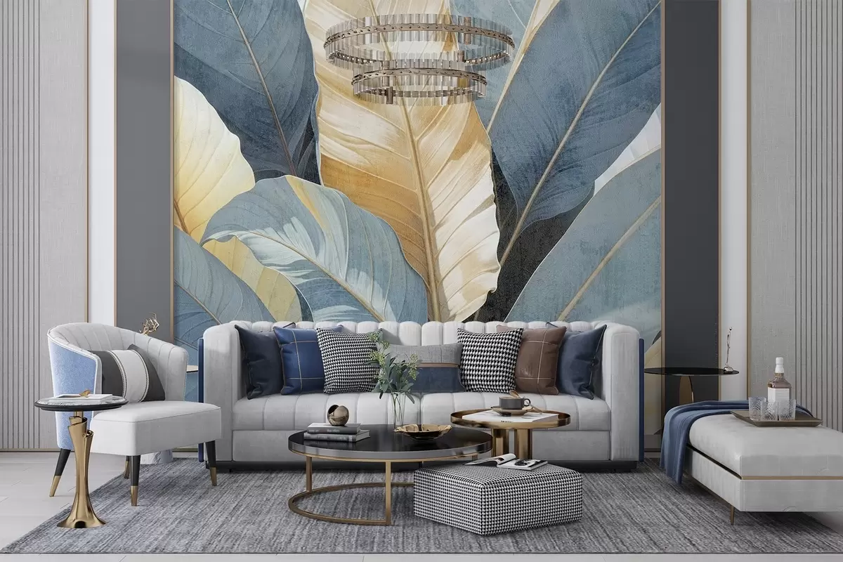 Fototapetes Tuvplāna skats uz lielām, sulīgām, teksturētām dekoratīvām tropu lapām zilos, zaļos un dzeltenos toņos Nr. w08373