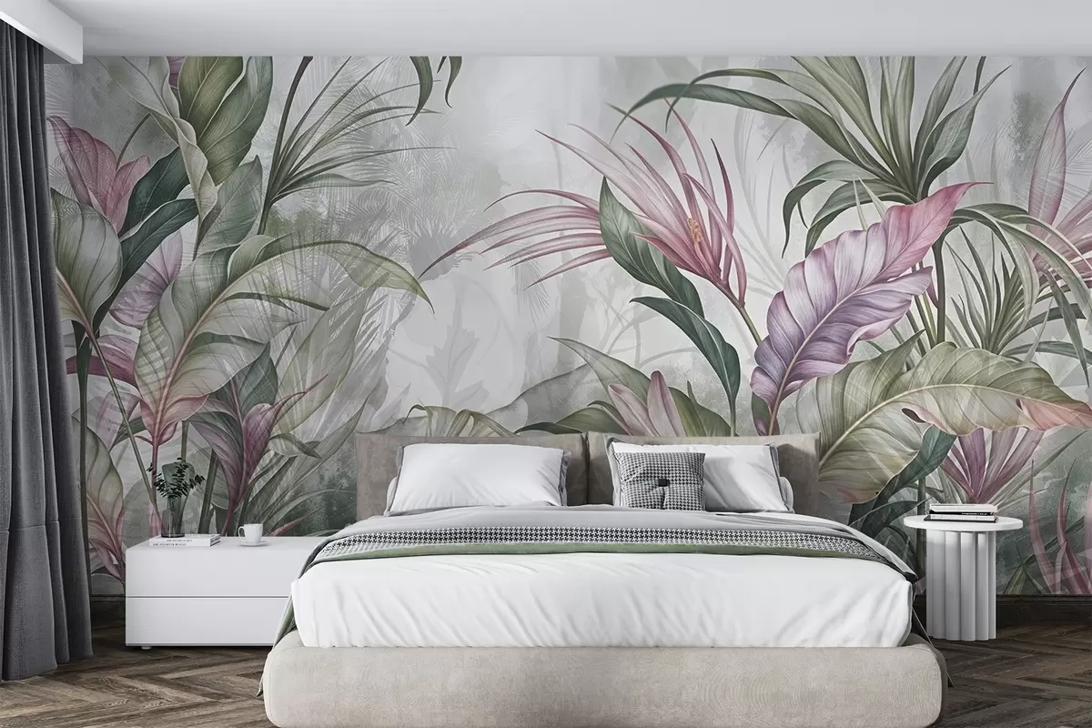 Fototapetes Tropu džungļi ar lielām zaļām lapām un rozā proteja ziediem ar izplūdušu teksturētu fonu Nr. w08375