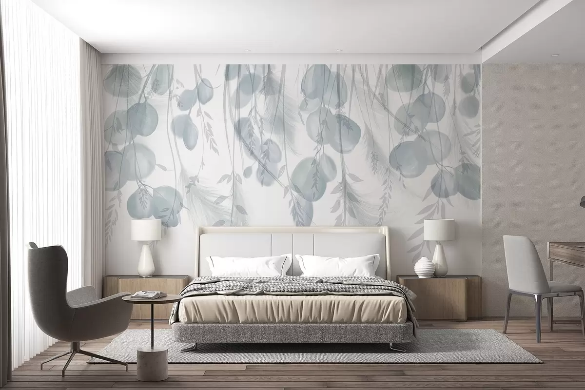 Fototapetes Smalki pelēkas un pasteļzaļas eikalipta lapas krīt, radot mierīgu un nomierinošu atmosfēru Nr. w08380